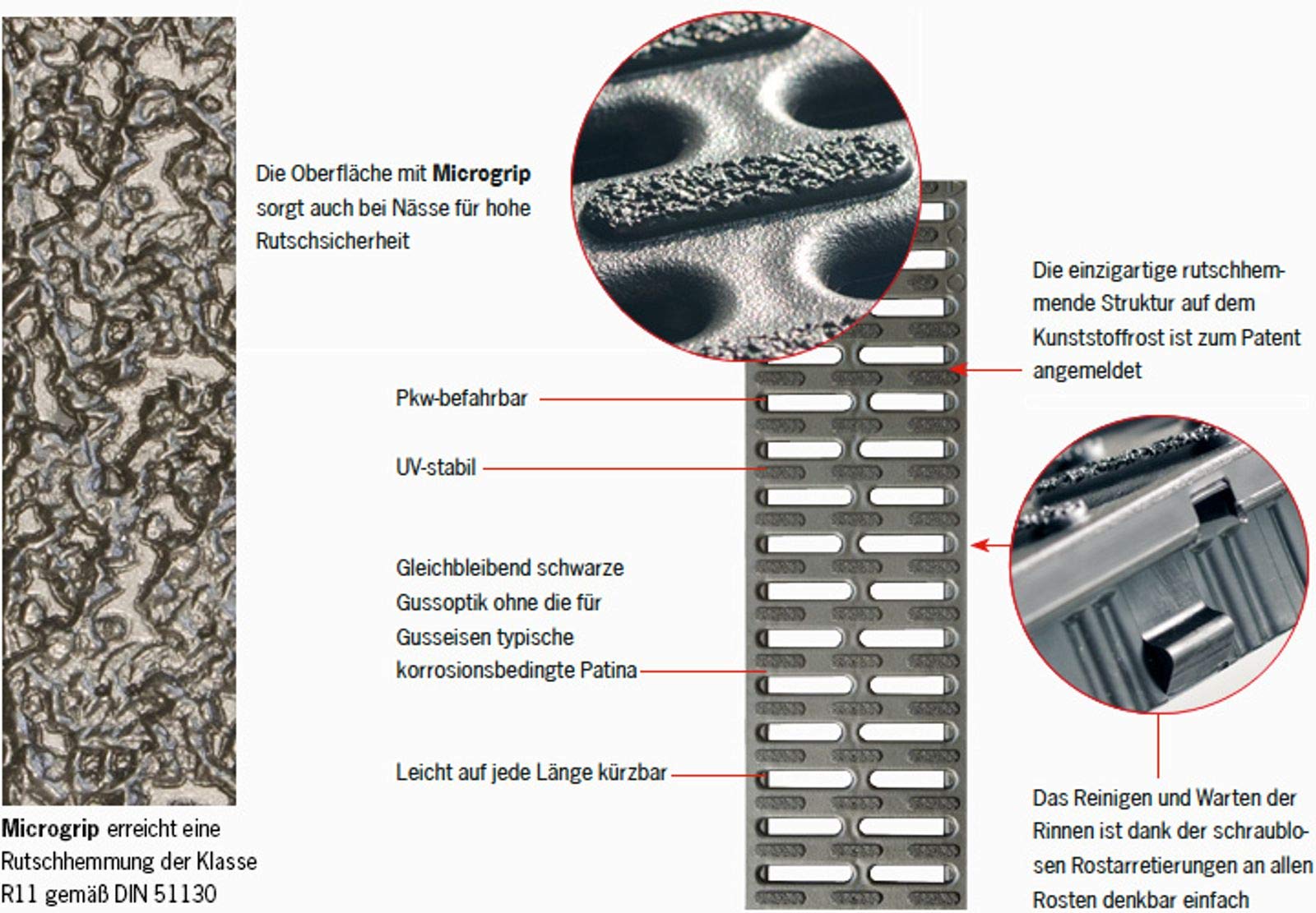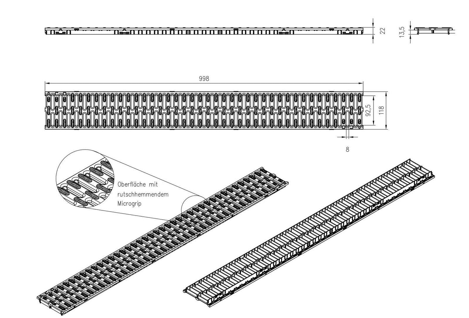 - Microgrip structure molded directly into the grate surface and therefore particularly durable / even under heavy use, the plastic grate retains its anti-slip properties