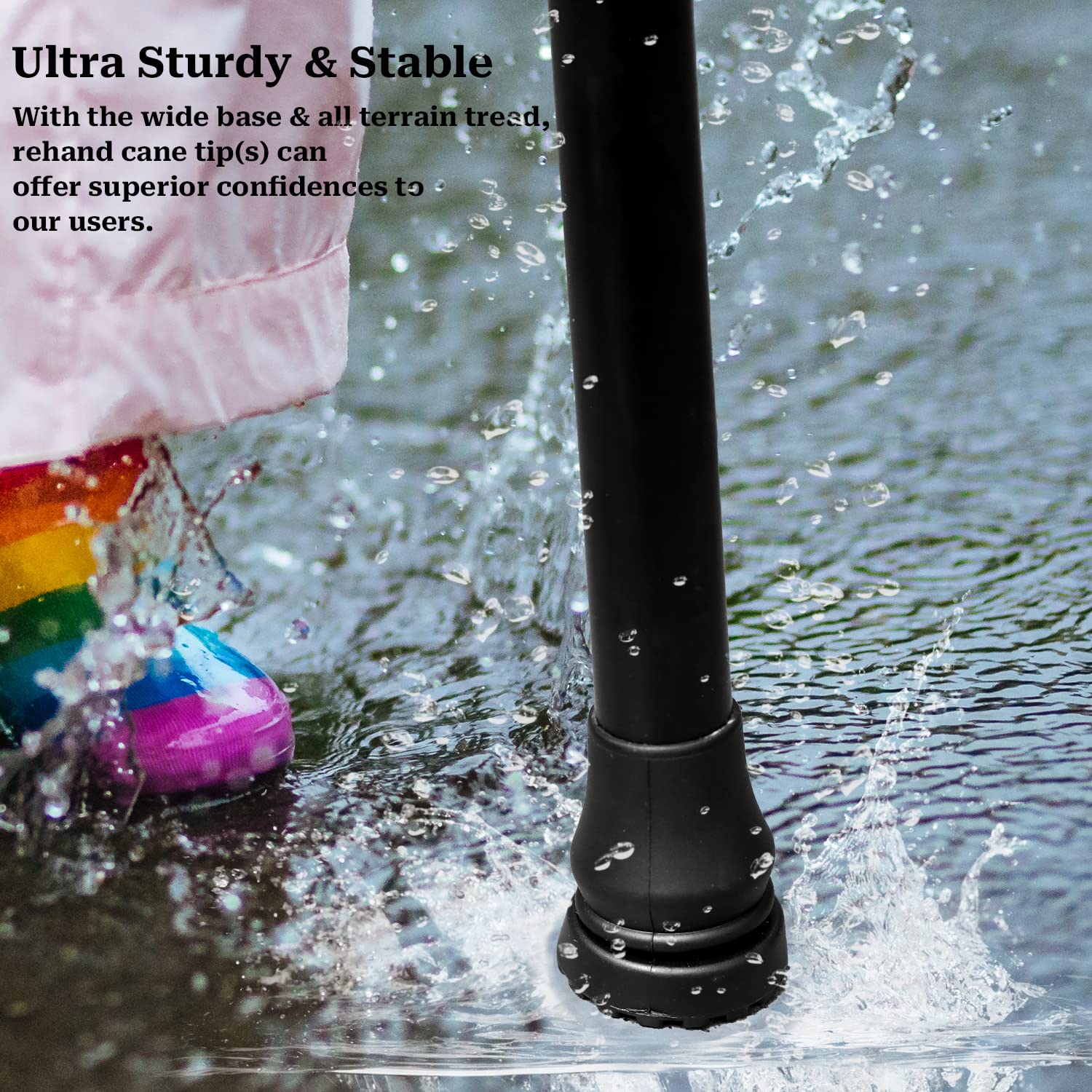 - Universal Cane Tips - The rubber cane tips are widely suitable for walking sticks, hiking poles, seniors, crutches, and quad poles. They will play a role when walking on uneven pavement, hard dirt, or loose terrain such as grass, gravel, mud, or sand.