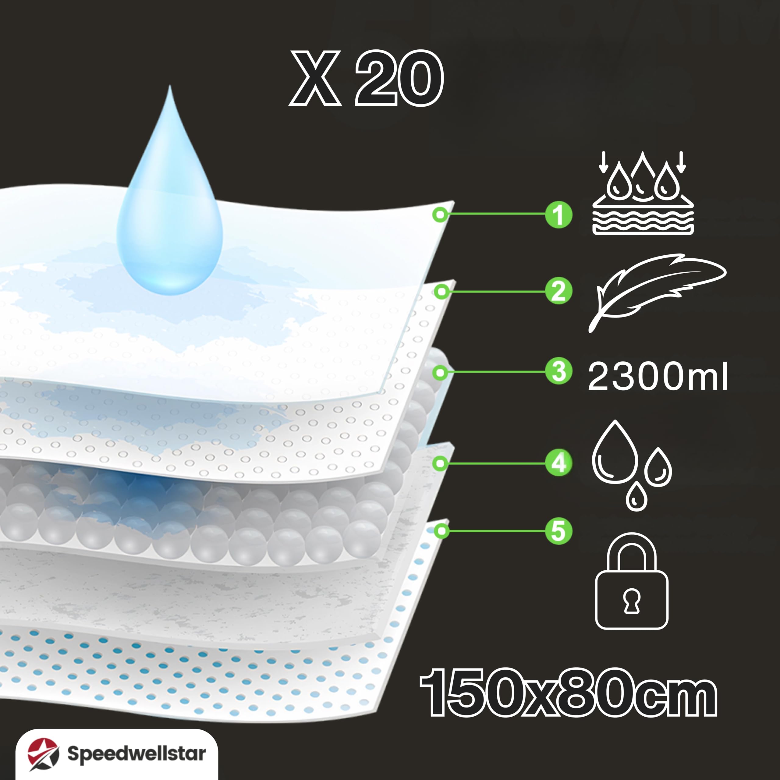 20 disposable incontinence pads for beds, size XL, 150 x 80 cm, hospital quality, highly absorbent, absorbs up to 2300 ml