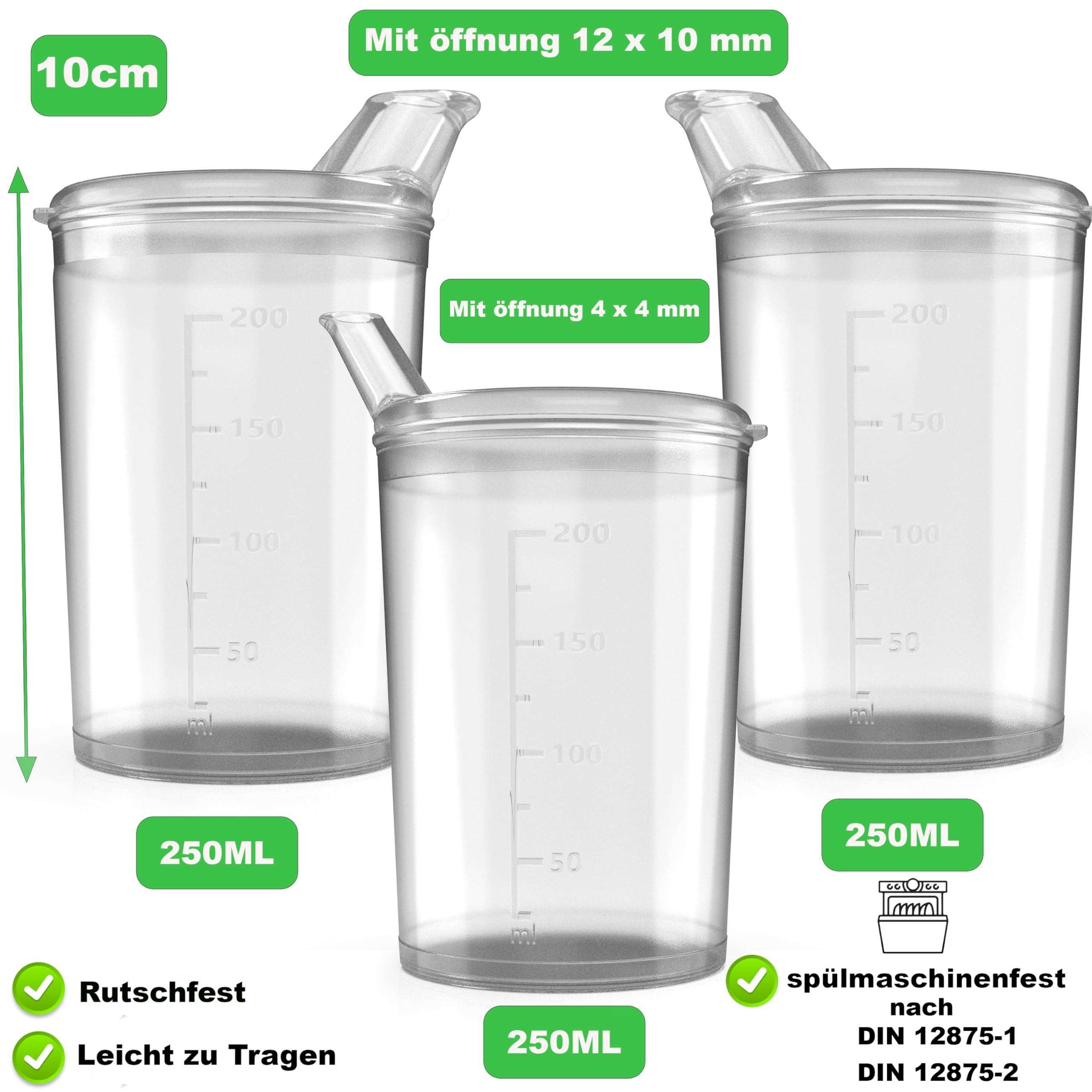3x sippy cups with lids 250ml Transparent sippy cup seniors set of 3 cups with 3 lids (2 with opening 12 x 10 mm and 1 with opening 4 x 4 mm) drinking cup with lid - drinking cup baby