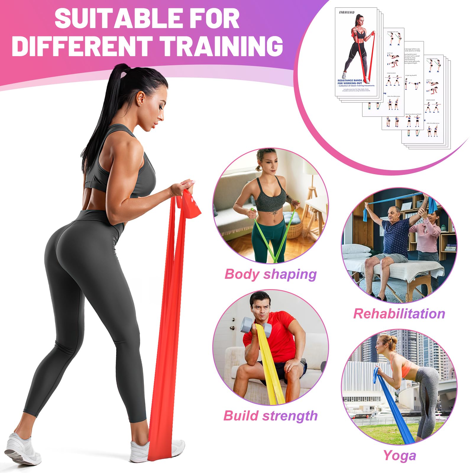 - Flexibility Training: The exercise resistance bands help you train your entire body: chest, back, shoulders, arms, hips, legs... to maintain good shape and improve flexibility. Train every day to build strength and boost your confidence!