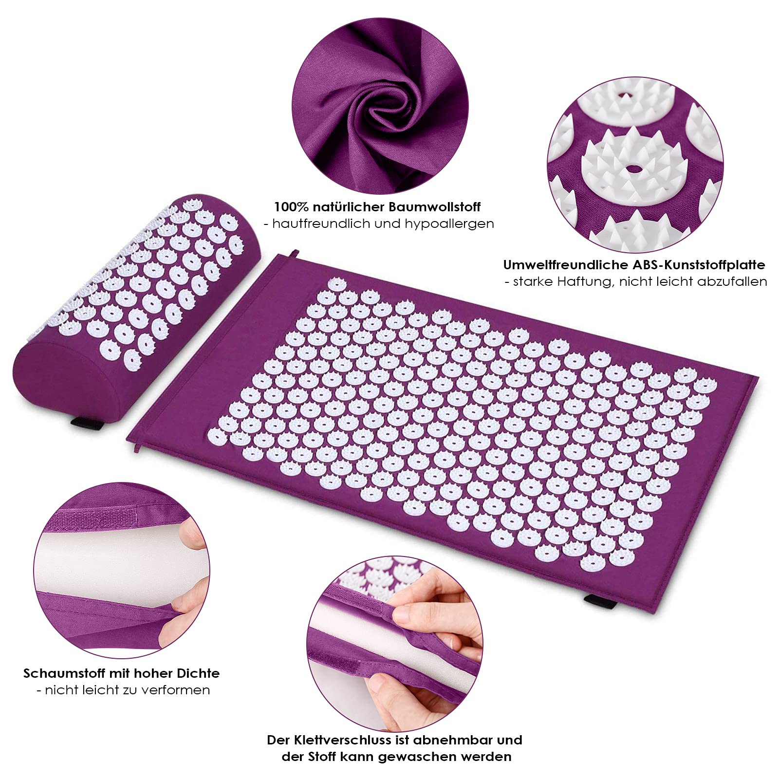 - 🧘♀️ECOLOGICALLY FRIENDLY MATERIAL: The acupressure mat with acupressure pillow is made of skin-friendly cotton fabric. The nubs are made of non-toxic acrylonitrile butadiene styrene (ABS) plastic. It contains no other potentially allergenic substances, so you can use it with confidence. The interior is filled with high-density foam that is resistant to deformation.