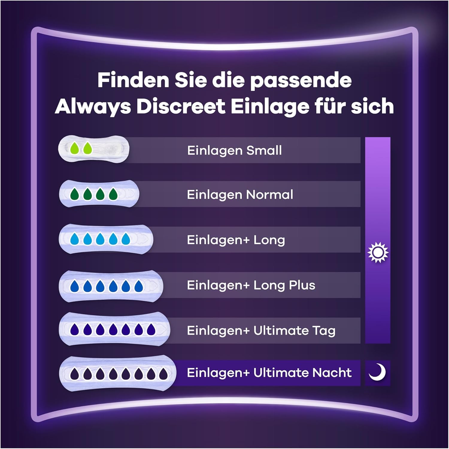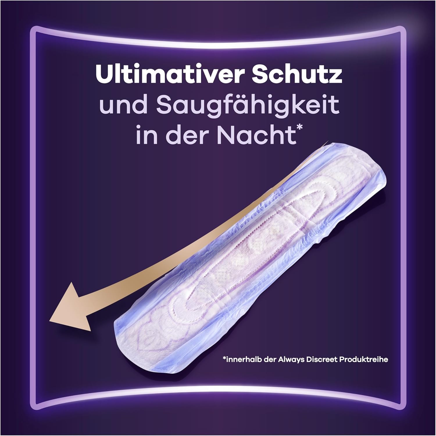 The most absorbant pad in this range, ideal for worry-free nights. Always Discreet Ultimate Night Incontinence Pads are extra secure. They're designed to give you extra comfort and absorbency, so you can rest easy. Their structure provides strong protection with an ultra-thin core, so you don't have to compromise between comfort and protection. If sneezing or laughing causes bladder weakness, Always Discreet Ultimate Night Pads offer optimal protection.