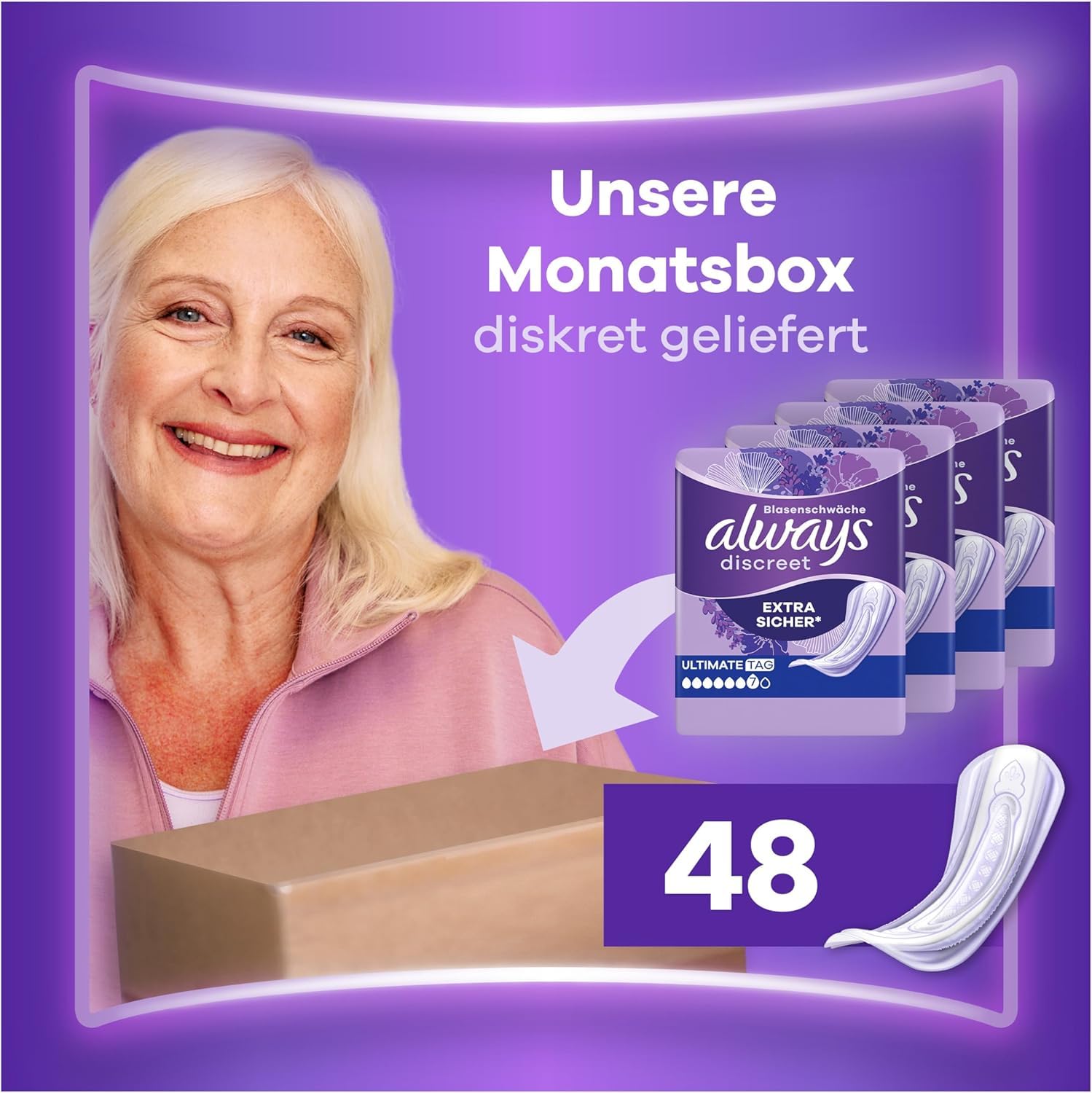 Always Discreet Incontinence Pads Plus Ultimate Day are extra secure and barely noticeable. They're designed to give you extra comfort and absorbency, so you can rest easy. Their structure provides strong protection with an ultra-thin core, so you don't have to compromise between comfort and protection. If sneezing or laughing causes bladder weakness, Always Discreet Ultimate Day Pads offer optimal protection.