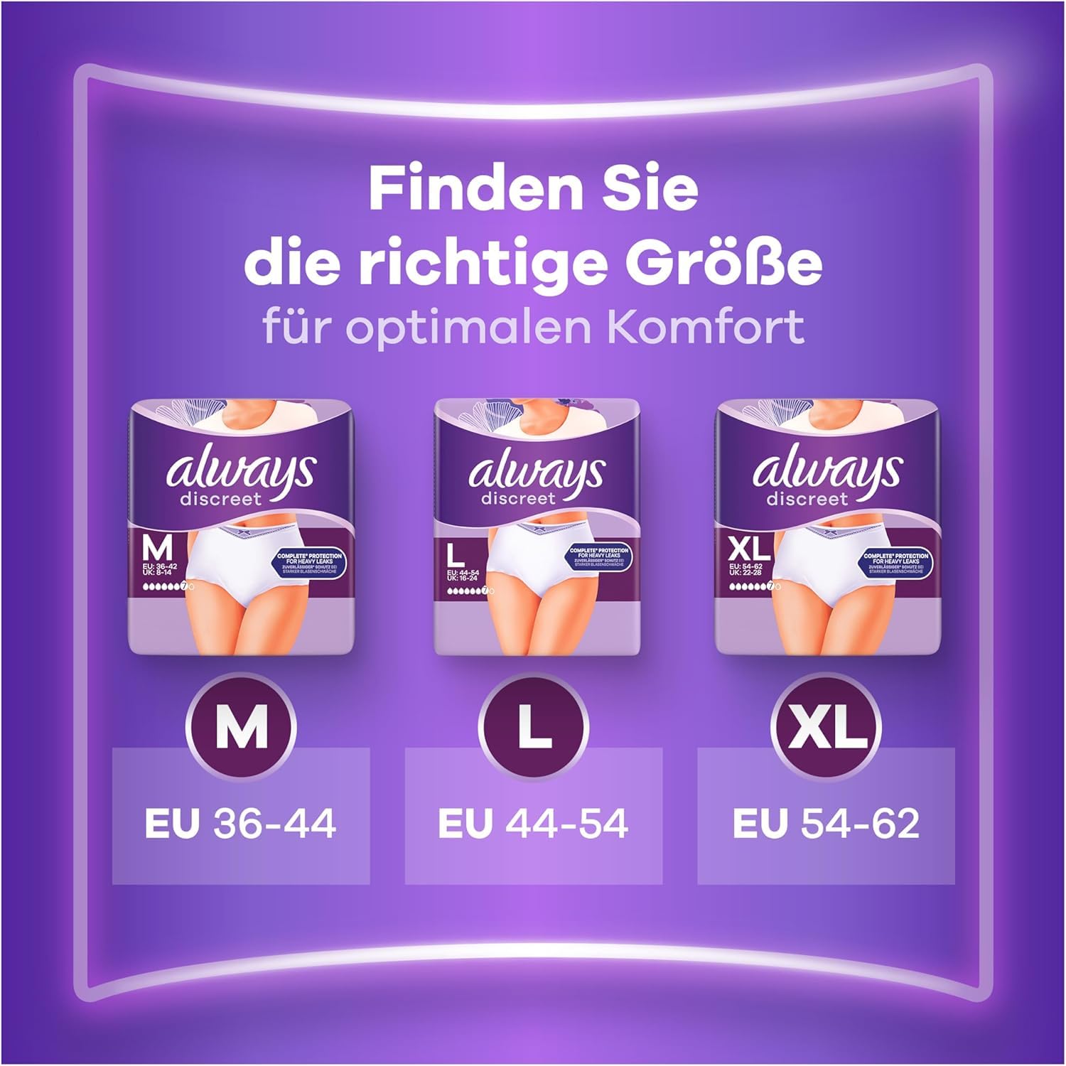 Incontinence doesn't have to be a reason for inactivity. With Always Discreet Incontinence Pants Plus L, you can stay active all day long—even if you lose large amounts of urine due to sudden urges to urinate. The super-absorbent underwear features RapidDry technology, which neutralizes odors in seconds when your bladder is weak. The double leak bands help stop leaks where they occur most. The 360° fit and comfortable design ensure a soft and comfortable fit, allowing you to move with confidence while offering amazingly discreet protection. Try the Always Discreet Incontinence Pants Plus L. Also suitable for postpartum incontinence. If you're looking for black panties and incredible protection, choose our Always Discreet Boutique underwear.