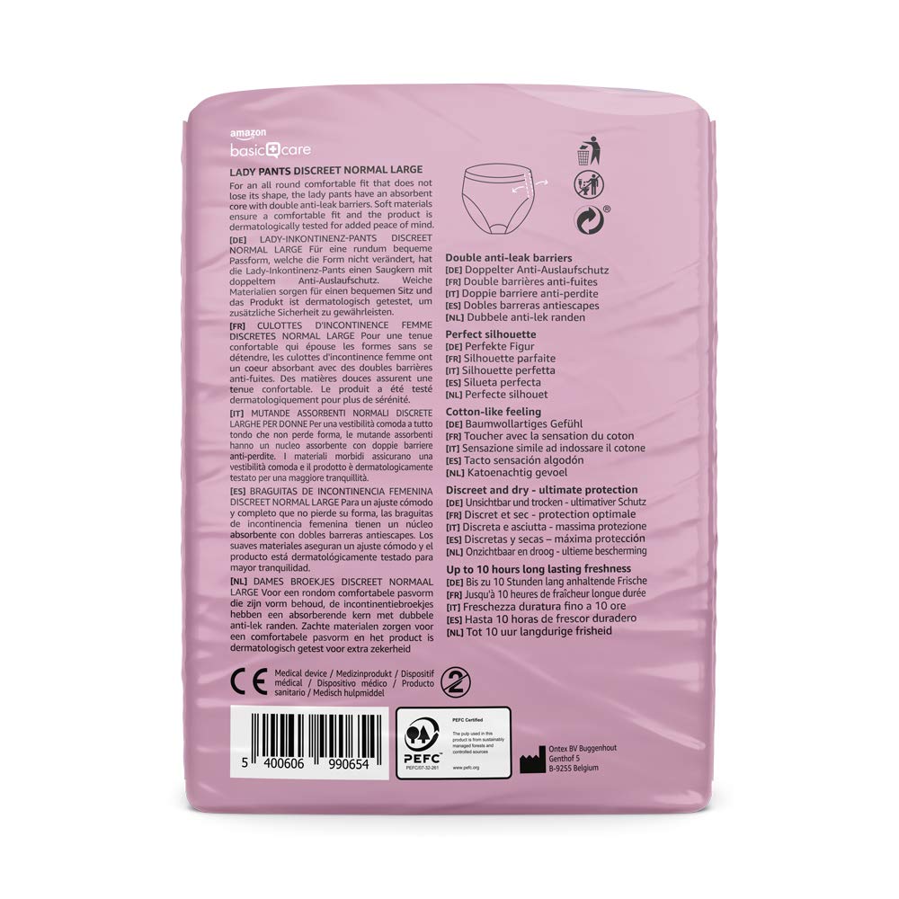 Amazon Basic Care Lady Pants Discreet Normal Large, 4-pack x 7 pieces. Lady Pants Discreet Normal Large – Absorbent, leak-proof, odor-control, comfortable, discreet, and like underwear