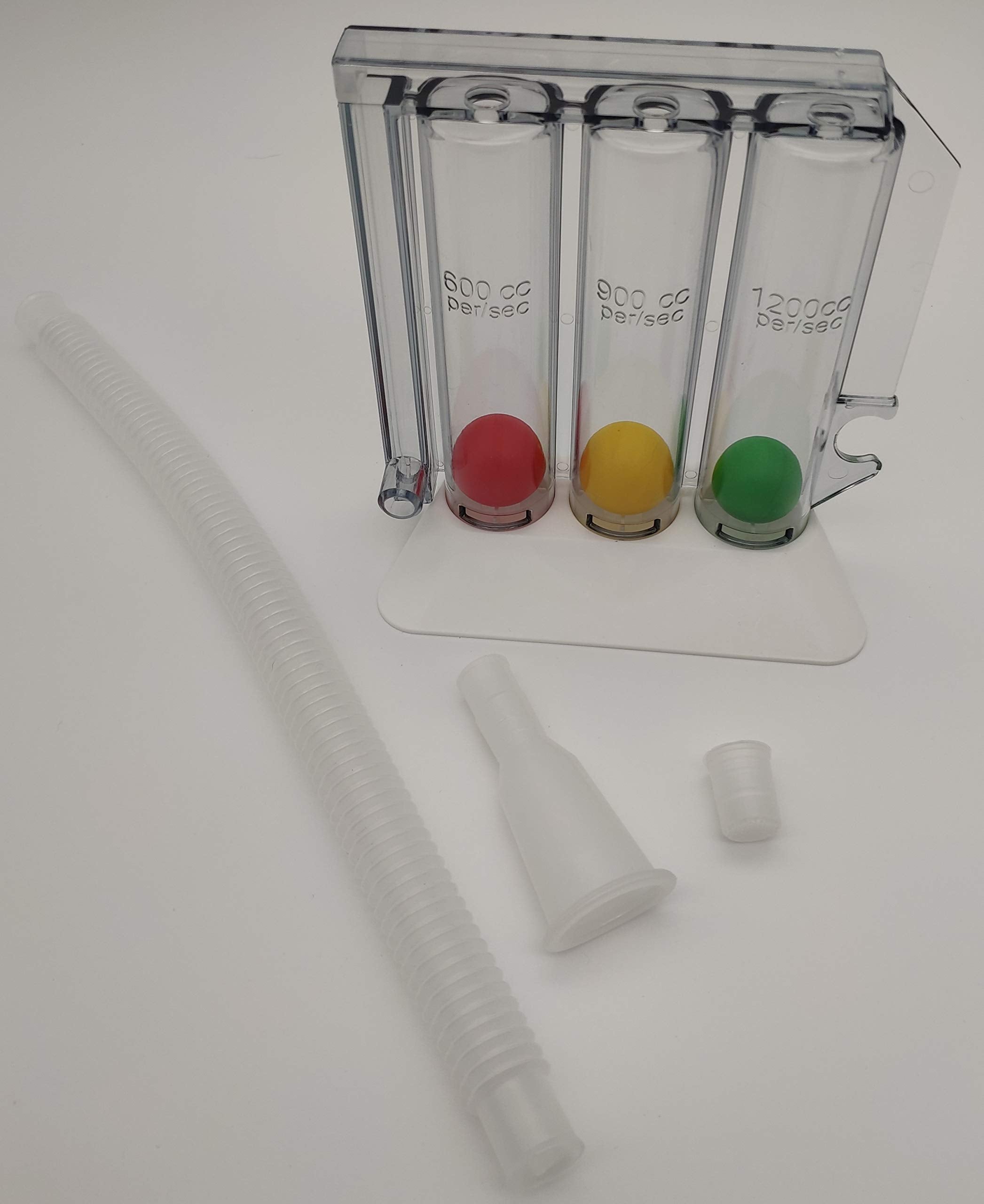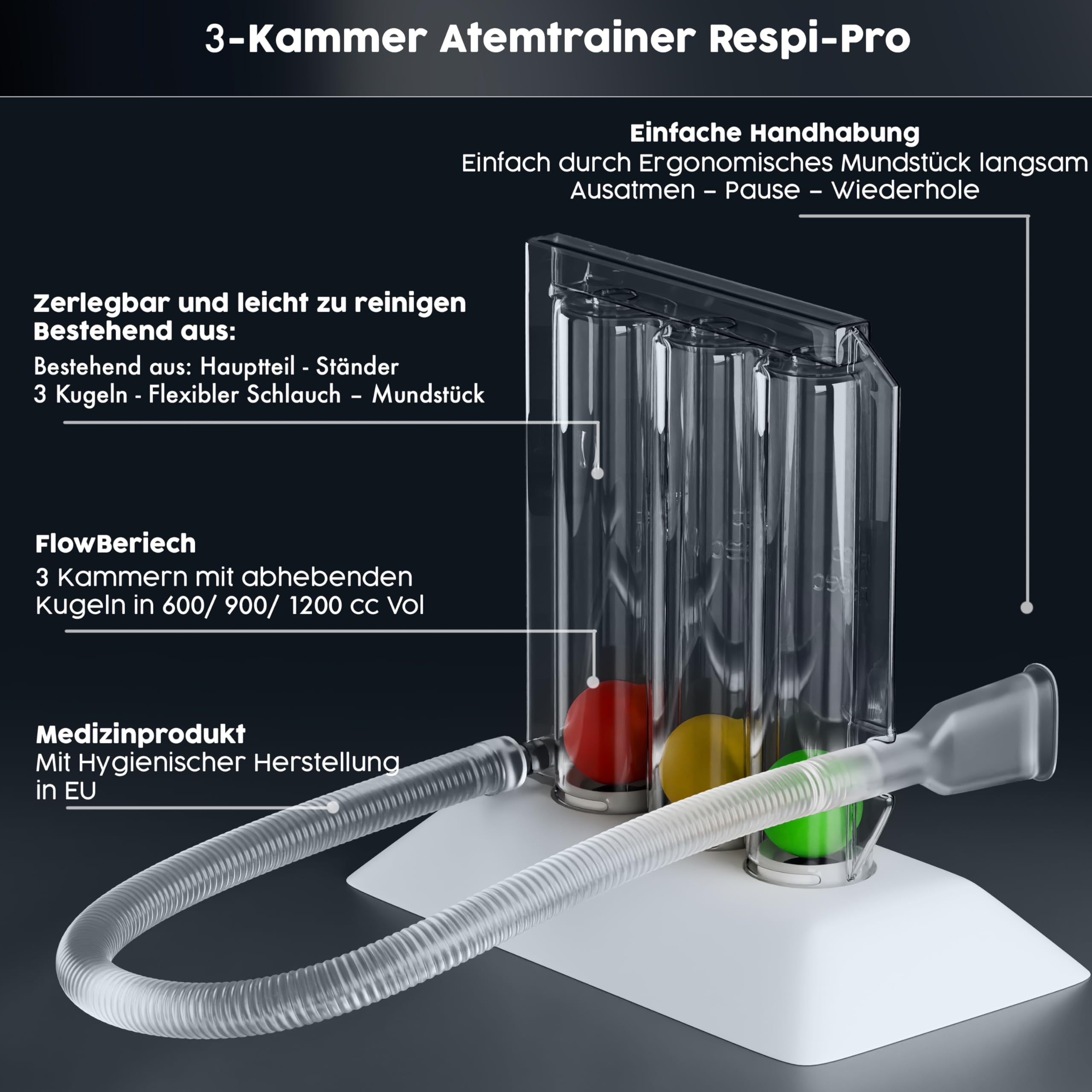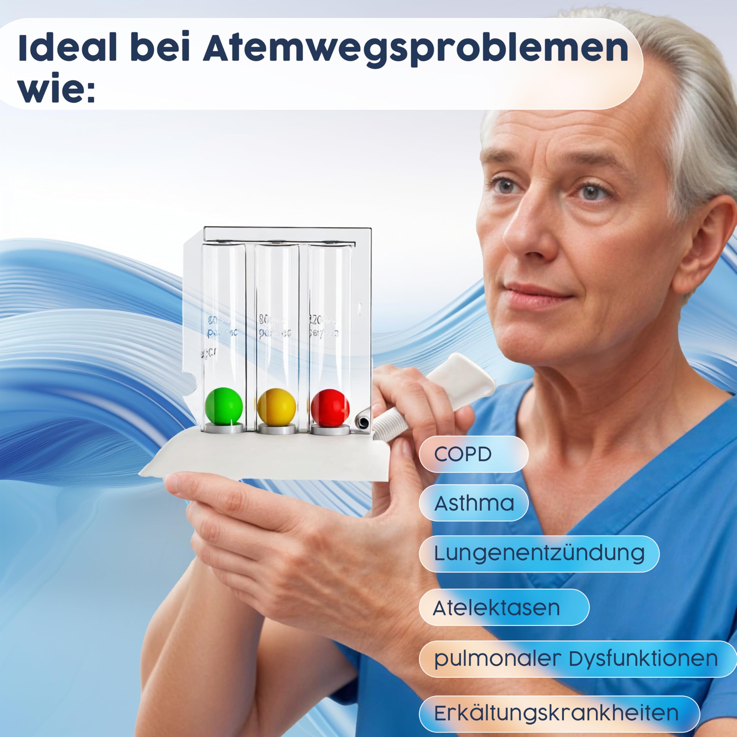 Breathing trainer with a 3-chamber system. Three floating indicators show the airflow. Developed for training the lungs through inhalation exercises, as a breathing-deepening measure and to promote ventilation. The volume-oriented breathing exercise device RESPIVOL is for a breathing volume of up to 1,200 cc. With us, you get the breathing training device including a guide e-book developed by therapists with important information and a further 18 very helpful breathing exercises. Especially now in these difficult times when respiratory diseases are severely restricting humanity, prevention is an important component. Even if you already suffer from a respiratory disease such as pneumonia, COPD, asthma, etc., you should definitely train your breathing. The breathing trainer has a compact design for determining the status of inhalation lung capacity and its restoration. The goals of these measures that can be achieved with the lung training device are: - Improvement of lung ventilation - Prevention of secretion accumulation in the lungs - Improvement of breathing behavior - Strengthening of the lungs - And much more The breathing device is characterized by: - A handy and easy-to-use training method of the breathing training device - 3 chamber system in professional design - Designed to enable slow, deep and maximum inhalation - Can also be used as a lung test device - Filter, hose and mouthpiece are removable for easier cleaning - Anatomically shaped handles make it easier to handle