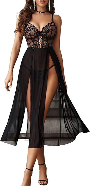 Avidlove Sexy Lingerie Women's Lingerie Set Lace Lingerie Mesh Babydoll V-Neck Underwear Corset Nightdress Longe Nightwear Side Slit Negligee, Black S