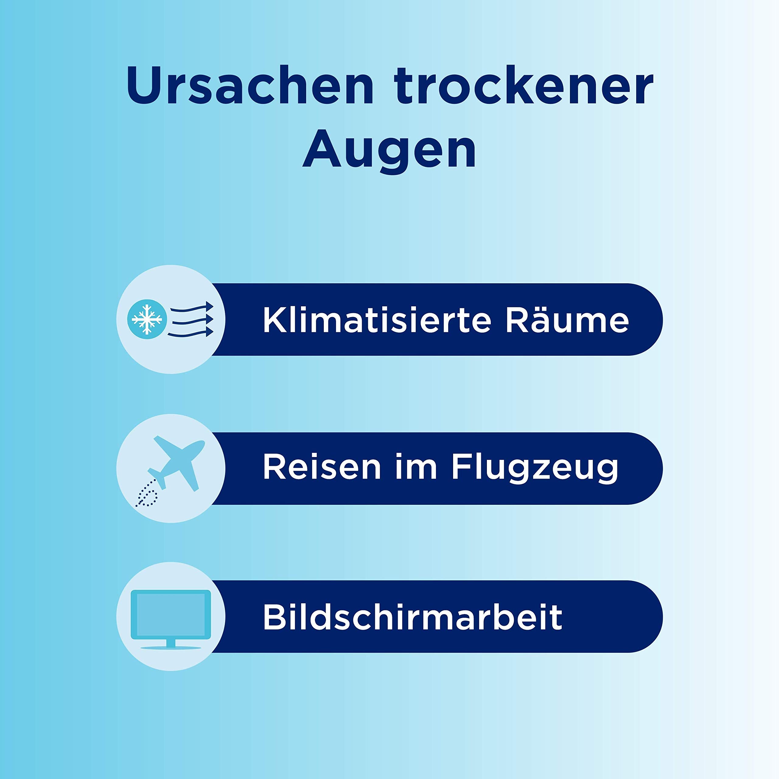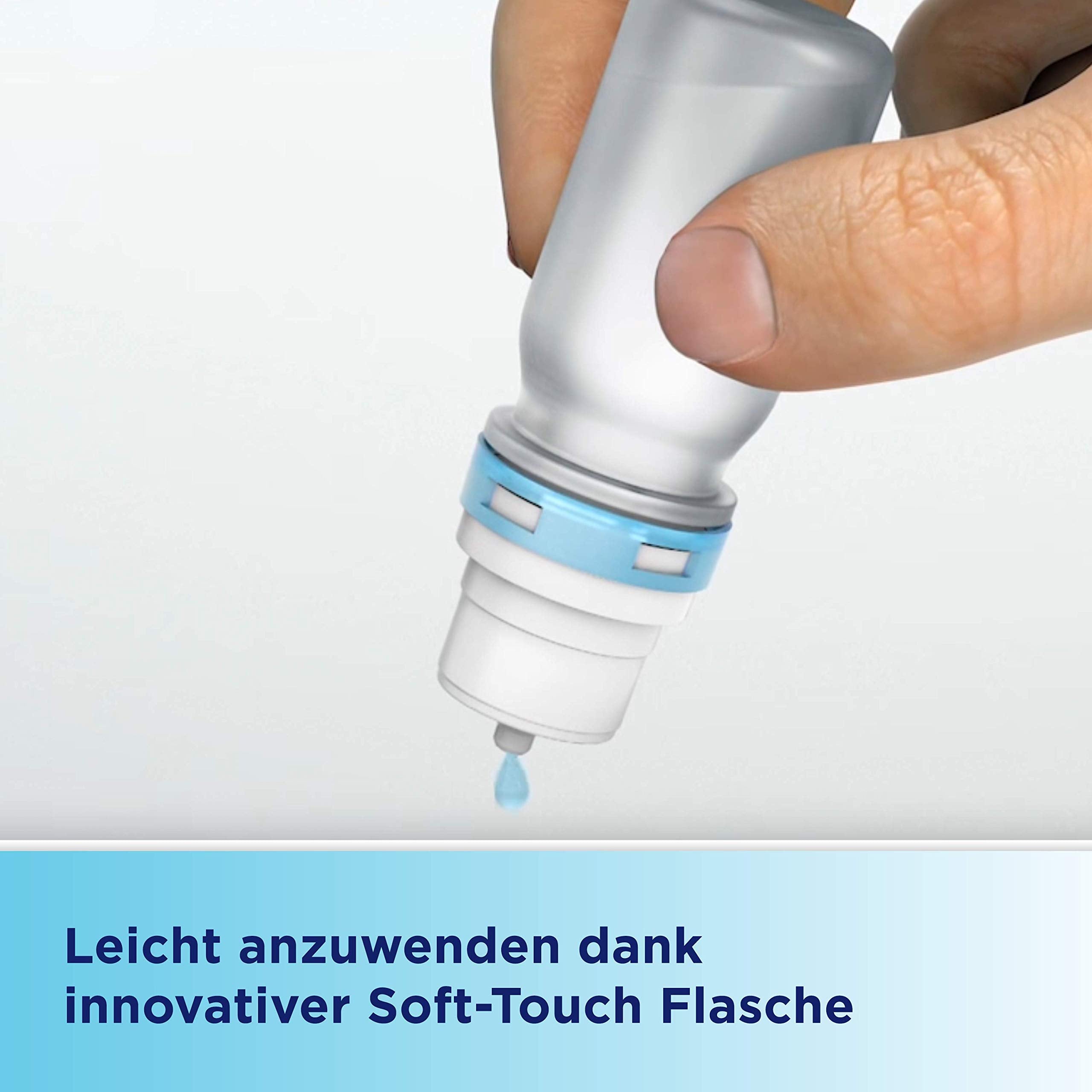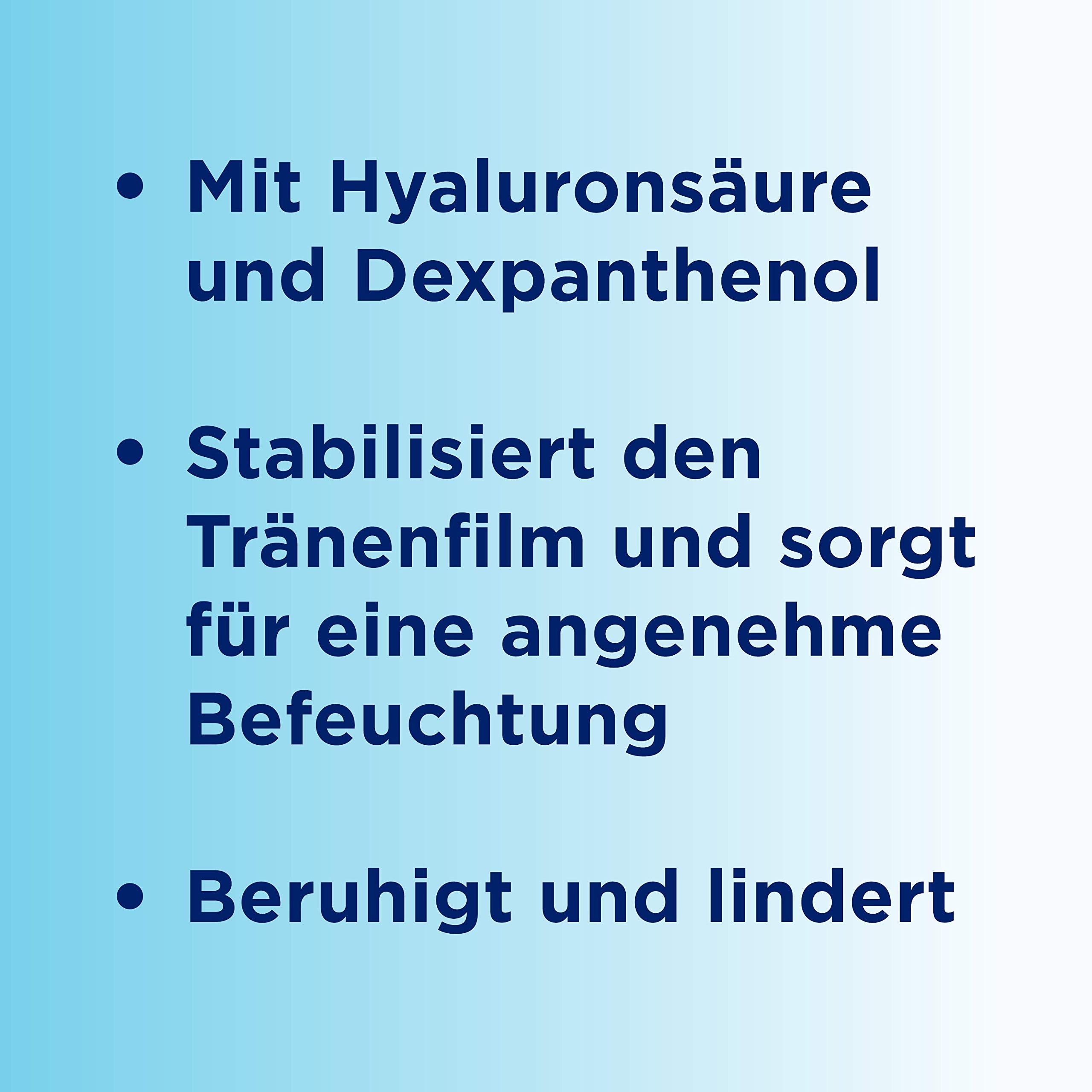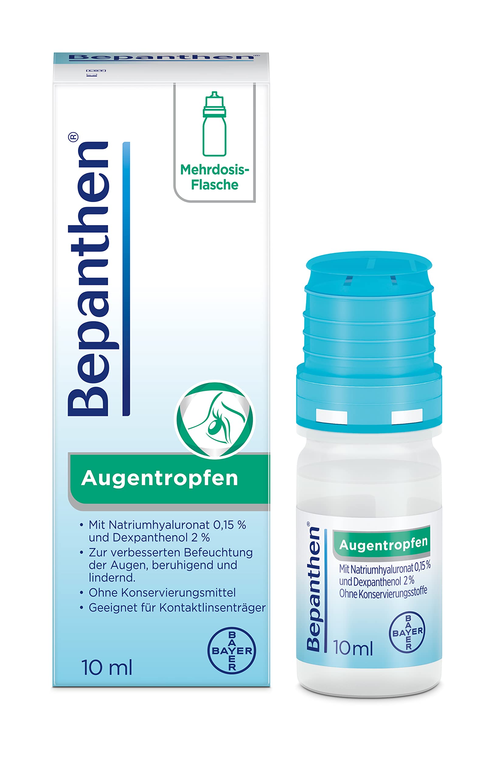 Bepanthen® eye drops moisturize and soothe dry, reddened, itchy, and burning eyes. The physical properties of sodium hyaluronate (hyaluronic acid) ensure a uniform yet stable protective film on the surface of the eye. The effect of the natural, strongly binding hyaluronic acid is supported by a second ingredient: dexpanthenol, also known as provitamin B5. It also has moisturizing properties and provides additional care for irritated eyes. Thanks to this combination, symptoms such as dryness or burning are gently but effectively relieved. The eye drops contain no preservatives or phosphates and can be easily applied to the eyes thanks to the soft-touch multi-dose bottle. Especially practical for contact lens wearers: Whether hard or soft, you don't need to remove your contact lenses before use. Once opened, the bottle has a shelf life of twelve months. Bepanthen® eye drops are also available in practical single-dose containers – ideal for on the go.