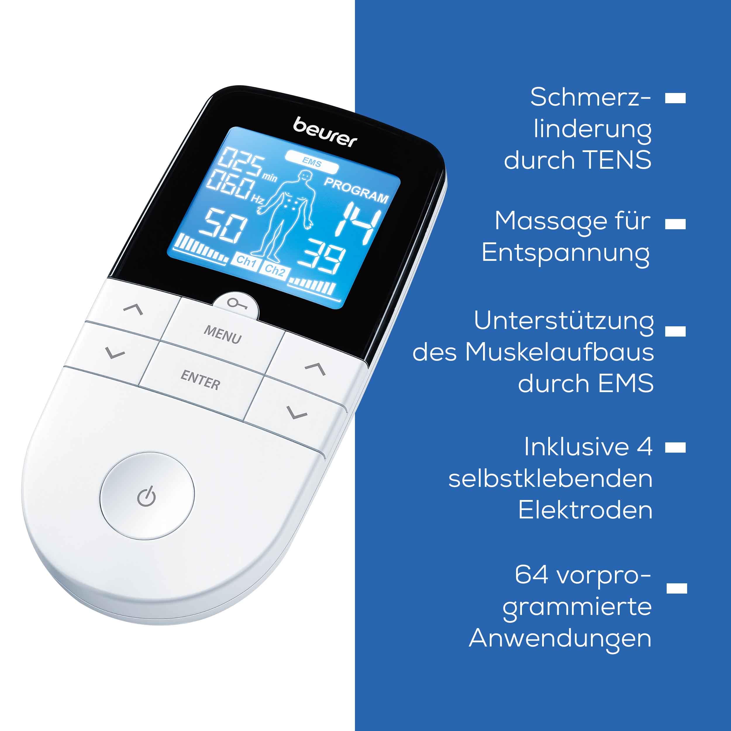 The three basic functions of the Beurer TENS device at a glance: Transcutaneous electrical nerve stimulation (TENS): The electrical impulses suppress the transmission of pain to the brain. For pain therapy in cases of cramps, injury, or chronic pain. Electrical muscle stimulation (EMS): The muscles contract and relax, similar to natural activation. To increase endurance, strengthen, and accelerate recovery in specific muscle groups. Massage function: A massage effect induced by electrical signals. To relieve tension, muscular fatigue, and accelerate muscle recovery.