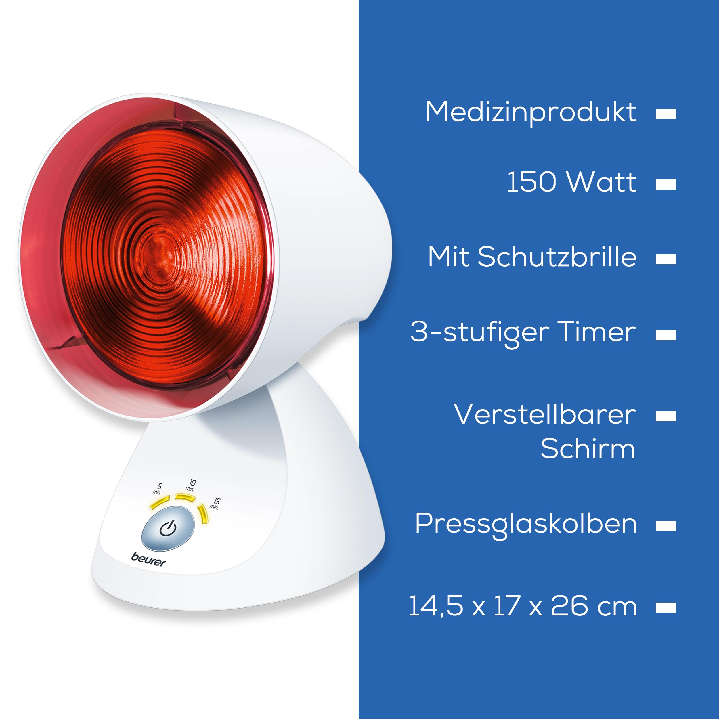 The most important features of the red light lamp at a glance: 3-stage, electronic timer with LED display for 5, 10 or 15 minutes treatment time Automatic shut-off function after the timer has expired Pressed glass bulb in the adjustable shade with 5 inclination levels Power 150 watts Product dimensions: 14.5 x 22.0 x 17.5 cm Product weight: approx. 800 g