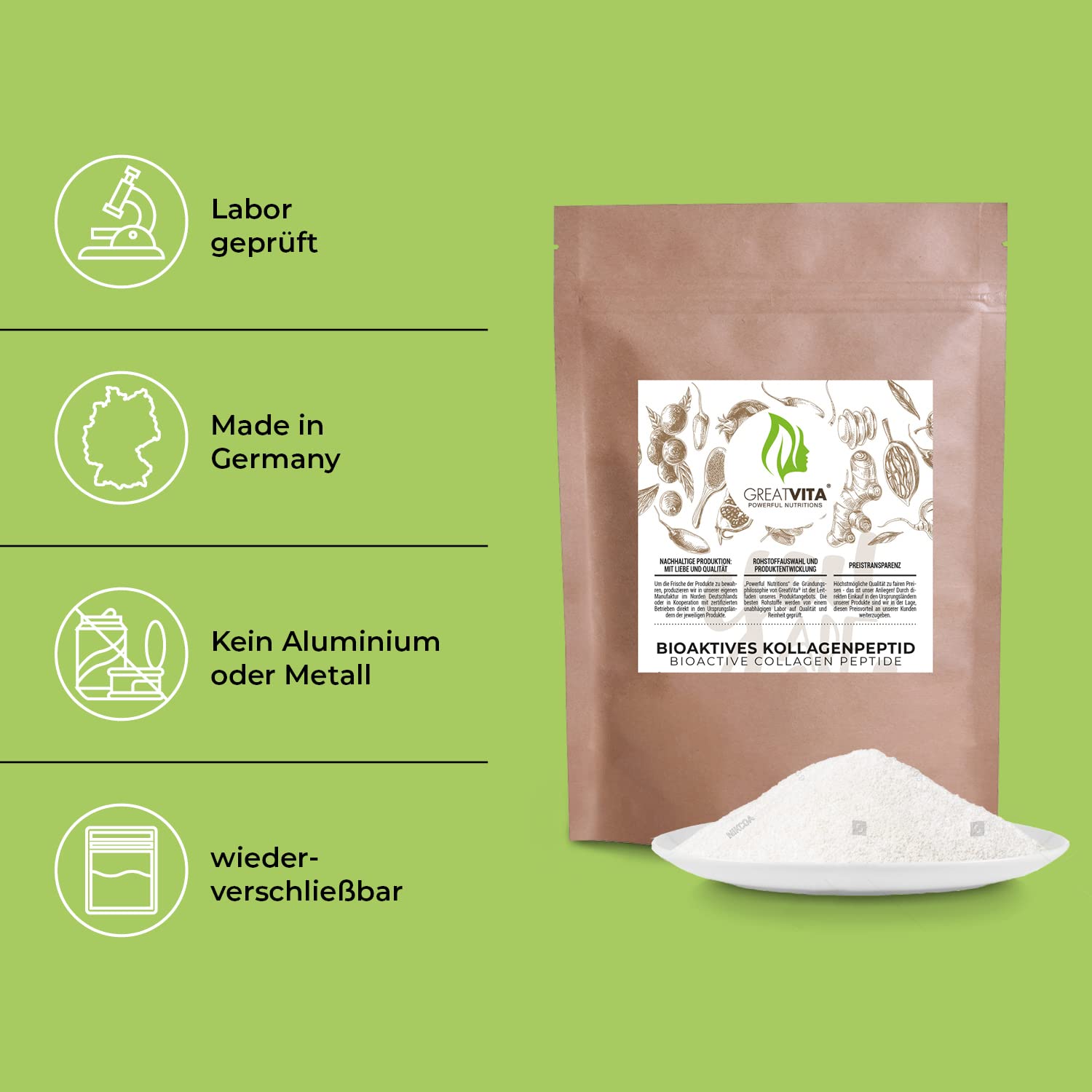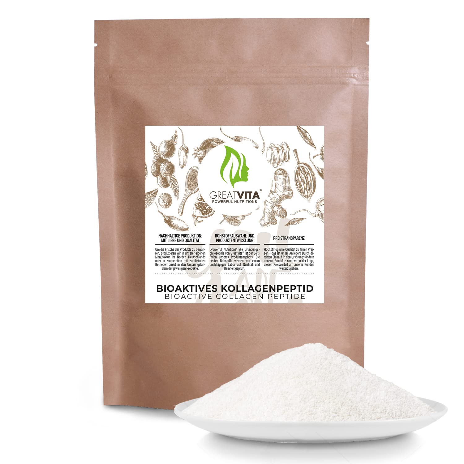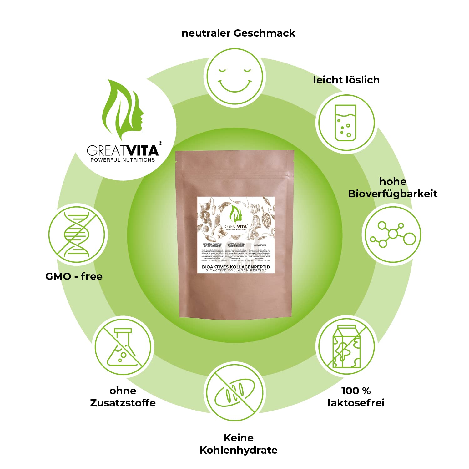 Details: Bioactive Collagen Powder from GreatVita This premium collagen powder contains pure, hydrolyzed collagen peptide types 1 & 3, which is derived from bovine hide and manufactured using a gentle process to ensure that all important nutrients are retained. This powder is free from additives and has a neutral taste, making it easy to mix into shakes, sauces, soups and smoothies. β Ideal for muscles and bones According to the EU Health Claim Regulation, proteins support the maintenance and increase of muscle and normal bones, making GreatVita's Bioactive Collagen Powder an excellent choice for anyone looking to improve their fitness and health. β Wide range of benefits Collagen is an important component of our skin, hair, nails, bones and joints. As we age, our body is able to produce less collagen, which can lead to wrinkles, sagging skin, weak nails and hair and joint problems. GreatVita's collagen powder can help reduce these problems by supporting your collagen production and providing your body with essential nutrients. β Recommended intake: The recommended intake is 10g-30g per day, depending on your needs and individual requirements. However, it is important that you adhere to the stated recommended daily intake and do not use the powder as a substitute for a balanced, varied diet and a healthy lifestyle.