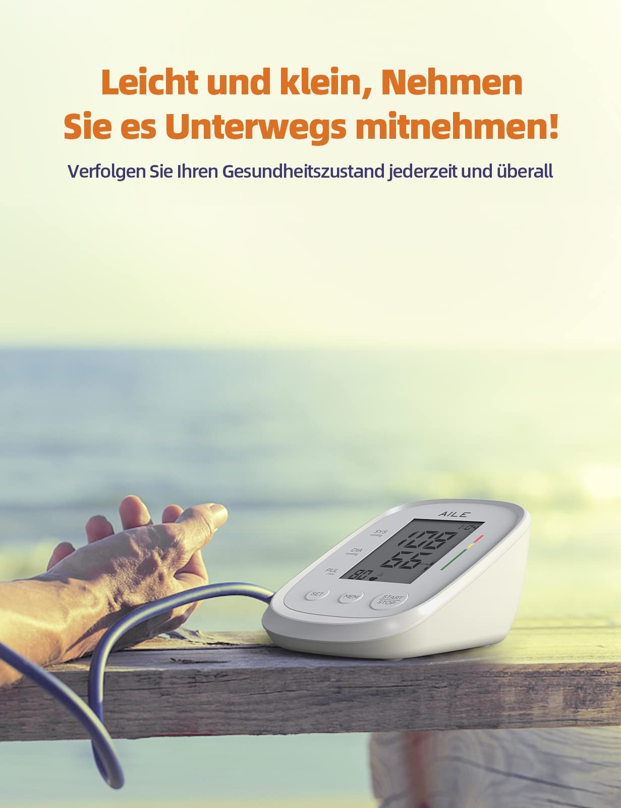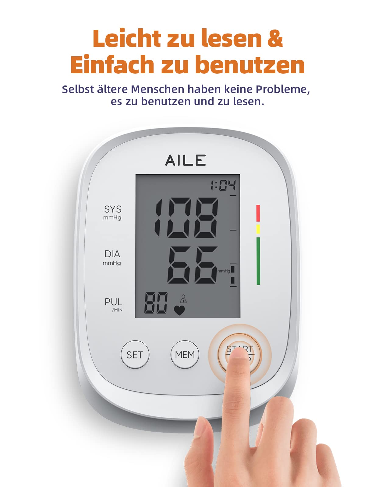 - šćAdjustable Large CuffćAILE blood pressure monitor with a wider range of 8.7" - 16.5" (22cm-42cm) upper arm, the blood pressure cuff fits most adult arms. Strong Velcro fasteners around the cuff secure it around the arm, and the high-quality anti-dust material makes the surface comfortable and easy to clean. The AILE blood pressure monitor protects your health!