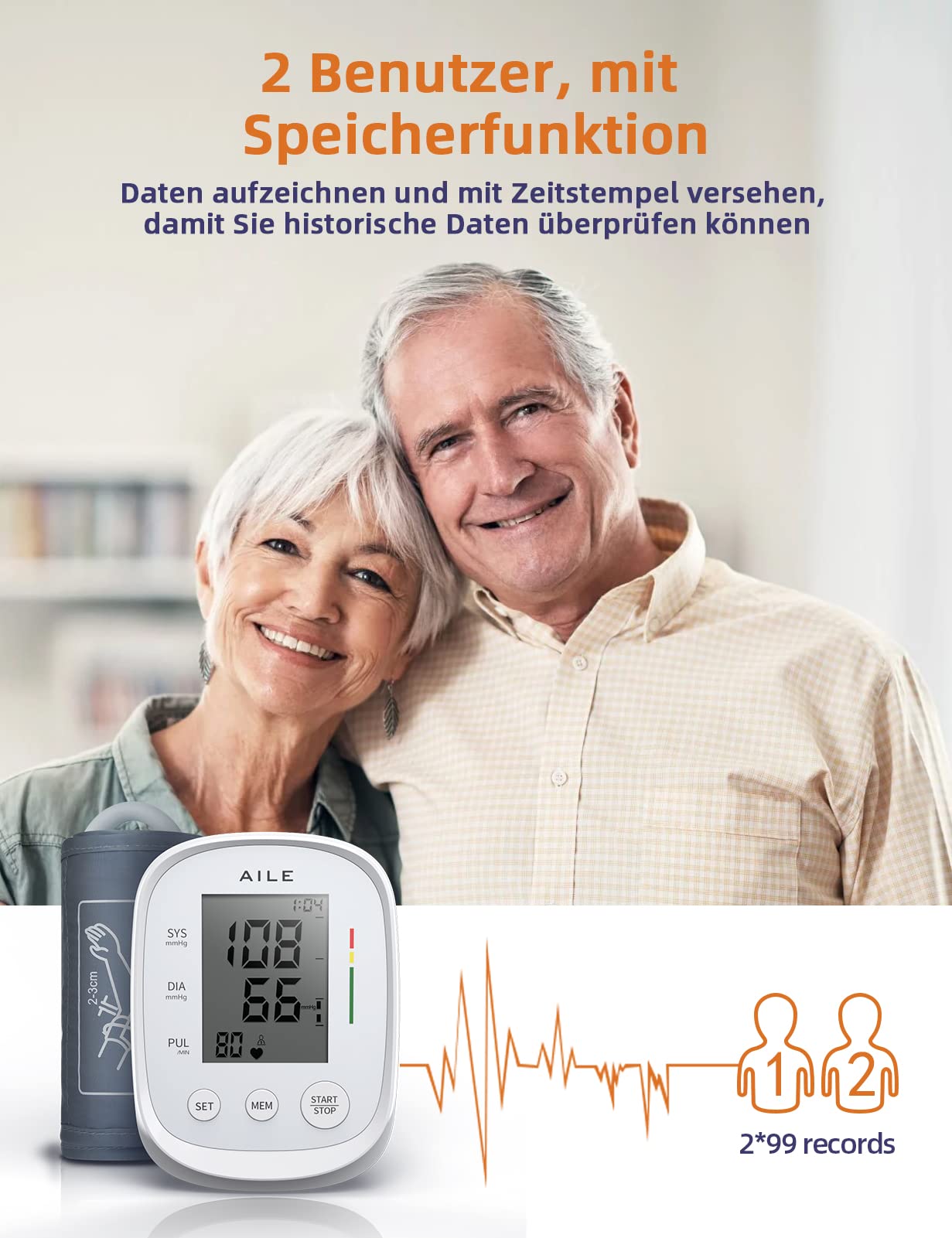 - šć2 Users Mode & 99 MemoryćAILE blood pressure monitor with large cuff recording allows 2 users to store readings independently. This small monitor can store up to 198 readings for 2 users (99 readings each) with a time stamp, which is convenient for monitoring historical data. The average of the last three readings is automatically displayed, much better than manual blood pressure monitors.
