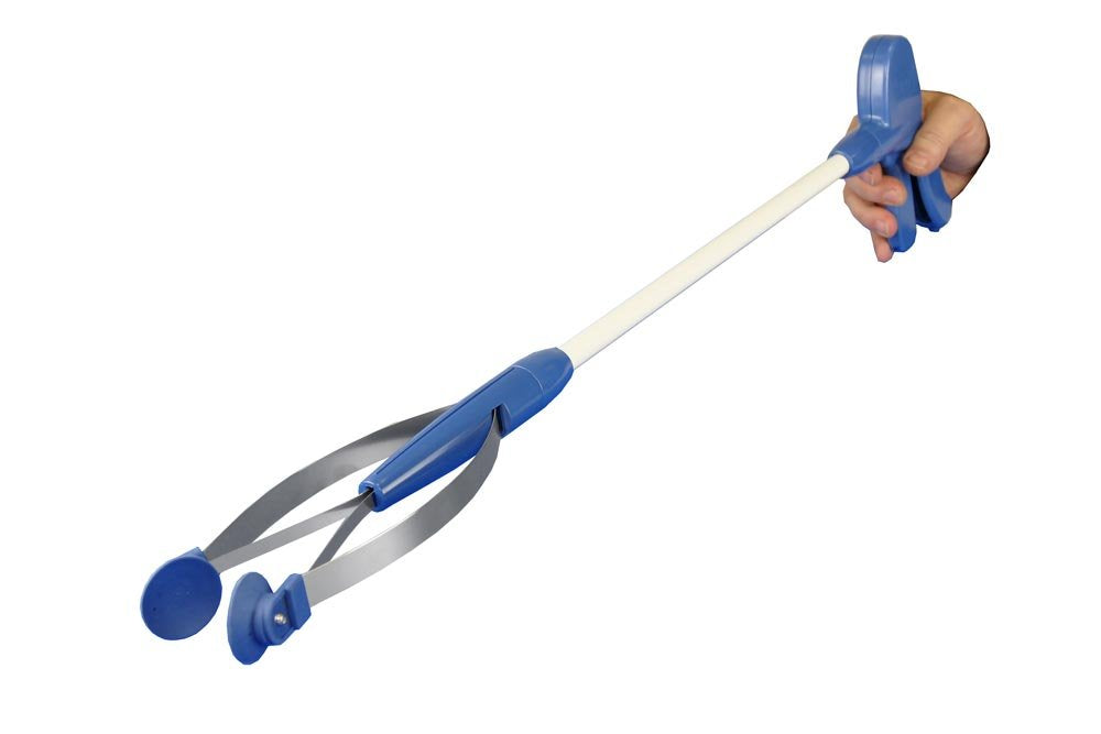 Details: EasyLife reacher, length 75 cm (1181...). This reacher features special rubber lips for gripping large and small objects (bottles, needles, etc.). Ergonomically shaped handle. Two adjustment options: short lever stroke - normal force required with unrestricted gripping ability; longer lever stroke - less force required with limited gripping ability. With locking mechanism, meaning grasped objects remain in place even after the handle lever is released. 1 piece.