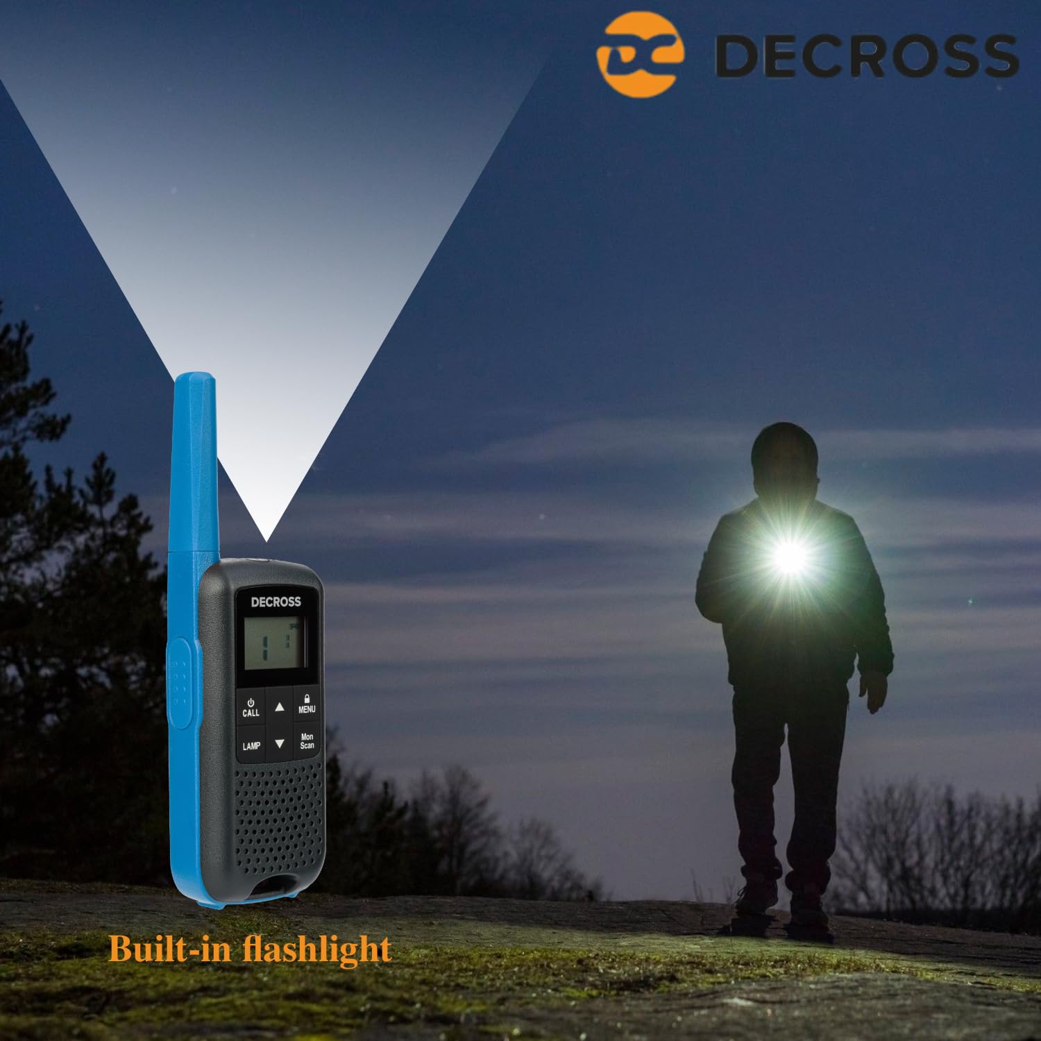 - 💡 Comfort: The DECROSS DC 63 Blue/Red features an ergonomic design for children and adults. The built-in flashlight will always help in the dark and also allows children to play interesting games. The walkie-talkie display has a bright backlight. Thanks to the IPX4 protection rating, you can fully concentrate on communication without worrying about splashes or dirt.