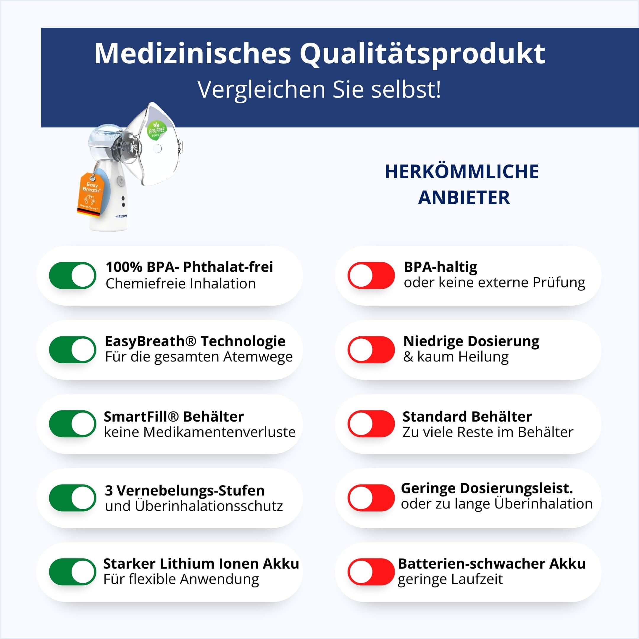 - ✔️ Laboratory-tested medical device – BPA-free masks, developed for hospitals and at home: The Easy Breath Plus meets the highest medical standards and is laboratory-tested – ideal for professional use in hospitals and comfortable use at home.
