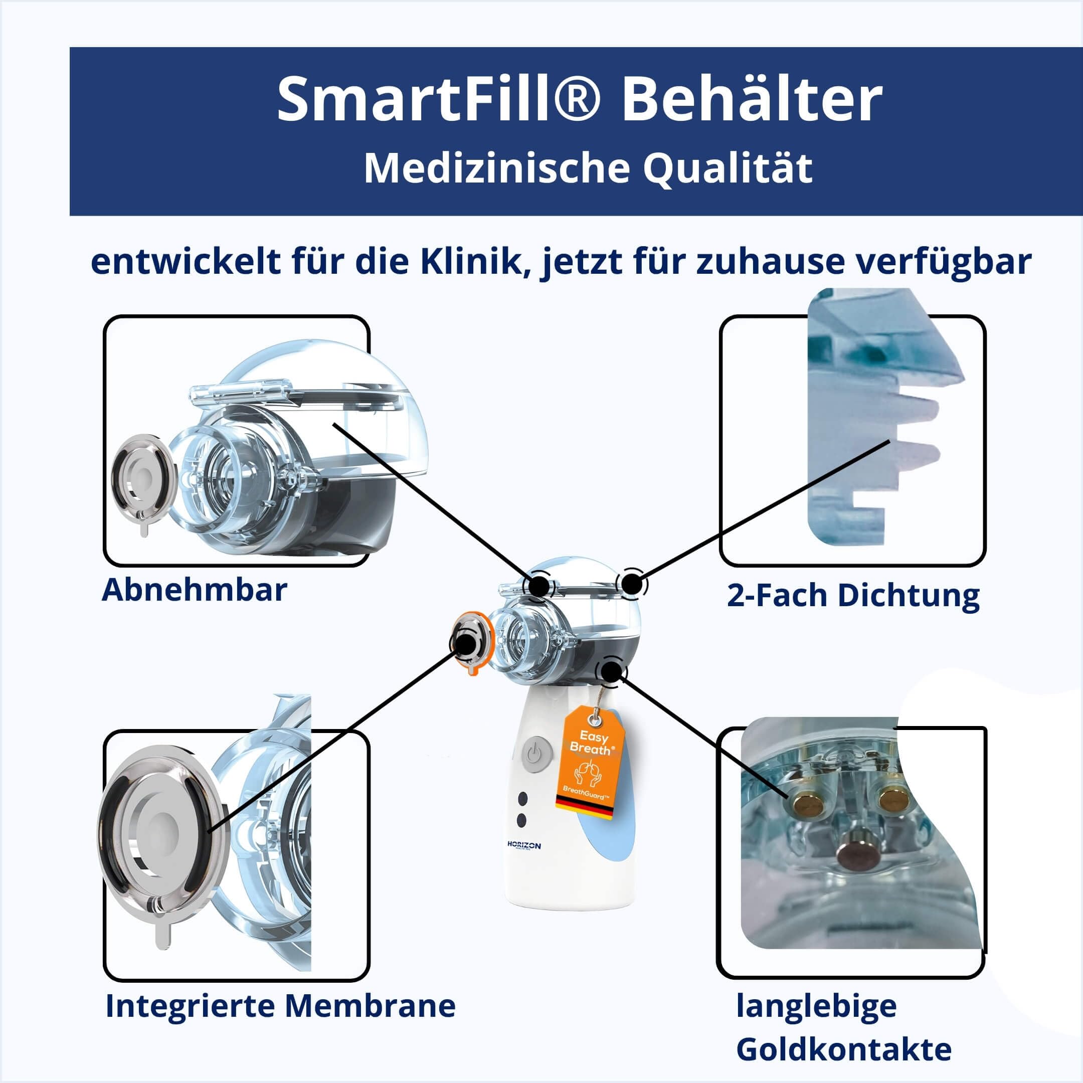 - ✔️ EasyBreath Technology – efficient and gentle treatment: EasyBreath technology generates ultrafine medical particles in three modes for effective treatment of all respiratory tracts – also ideal for medications such as salbutamol, ipratropium, or antibiotics. The Smart Fill container with an 18% incline ensures every medication is fully utilized.
