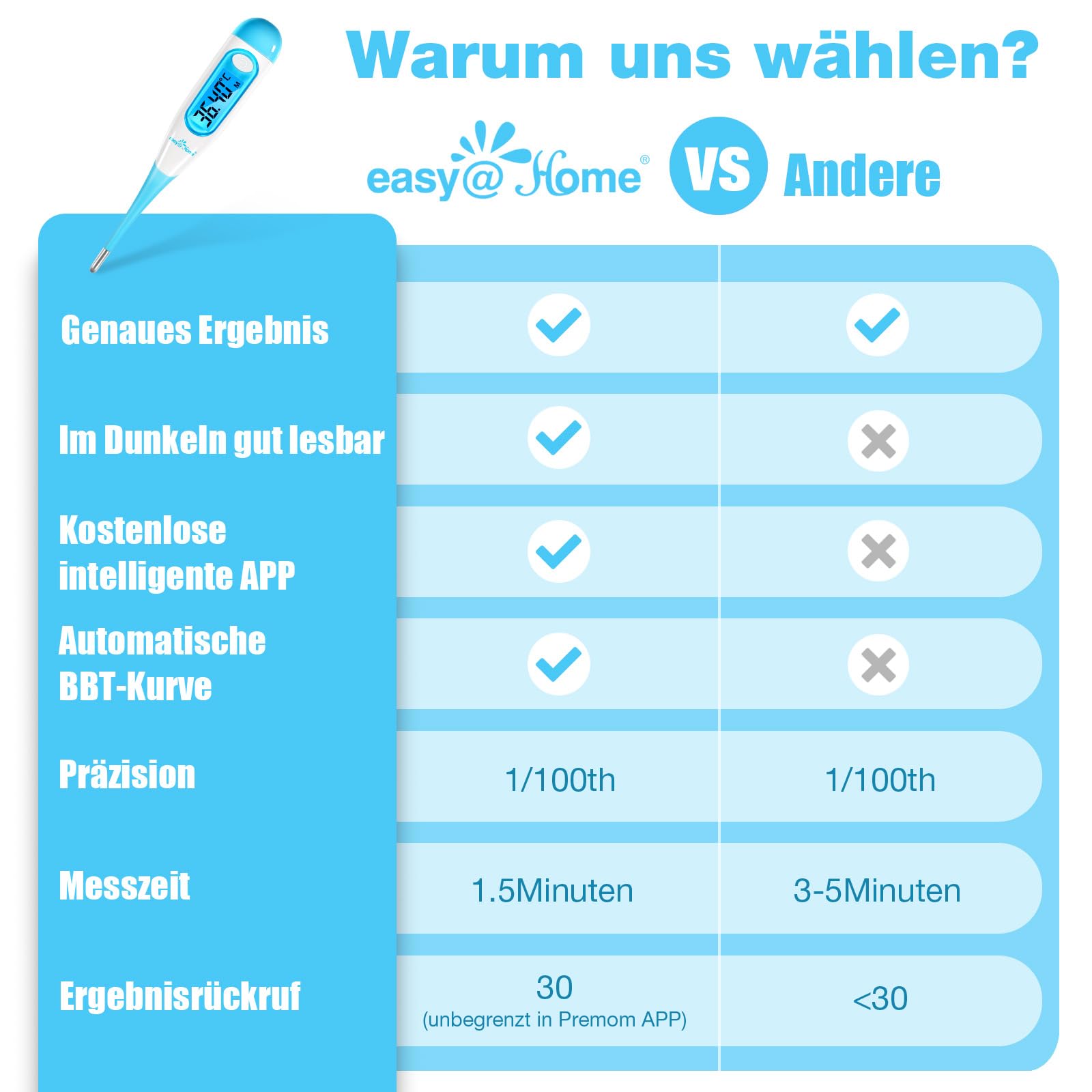 - ❤ WATERPROOF AND FLEXIBLE TIP: Waterproof and flexible thermometer tip for easy handling and cleaning. LARGE BLUE BACKLIT SCREEN: Easy to read in the dark. The thermometer can store 30 results, and the Premom APP can store an unlimited number of results.