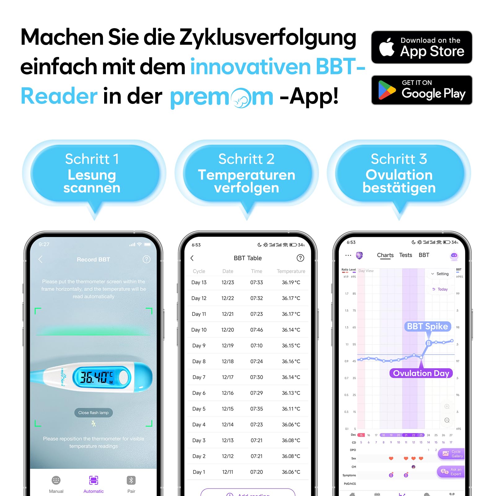 - ❤ SMART AND AUTOMATIC OVULATION TRACKER: Once you enter your temperature measured with our basal thermometer, TOP 1 ovulation tracker Premom APP can automatically draw BBT charts for you and automatically generate the coverline to accurately locate the BBT peak.