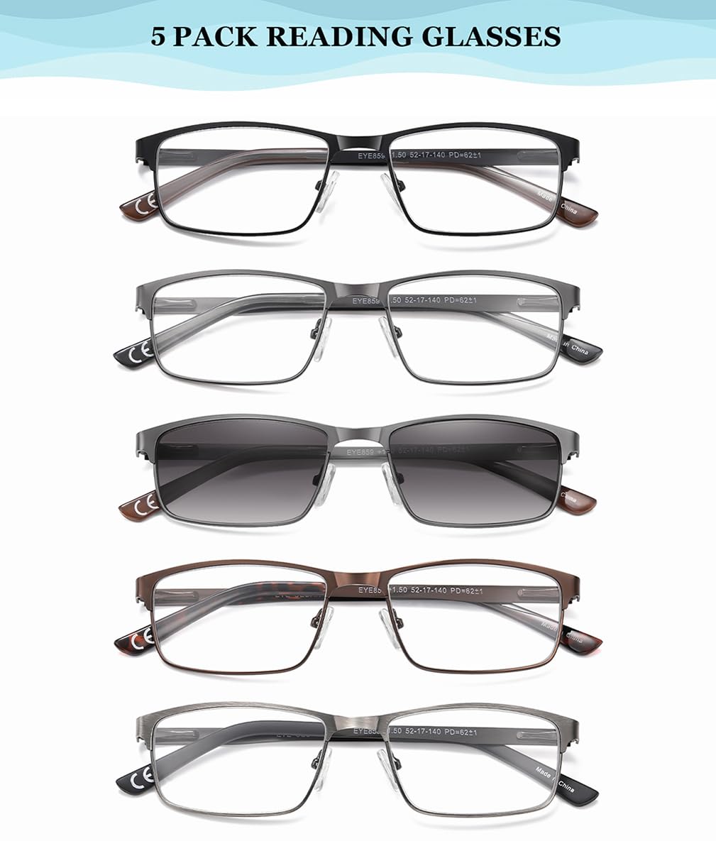 - 5-pack: These men's reading glasses are available in 5 colors, including black, gunmetal, brown, matte gray, and sunglasses. Tinted lenses filter UV light for outdoor use. Take a pair of glasses with you wherever you go; place a pair at your favorite reading spot for easy reading on the go and in everyday life.