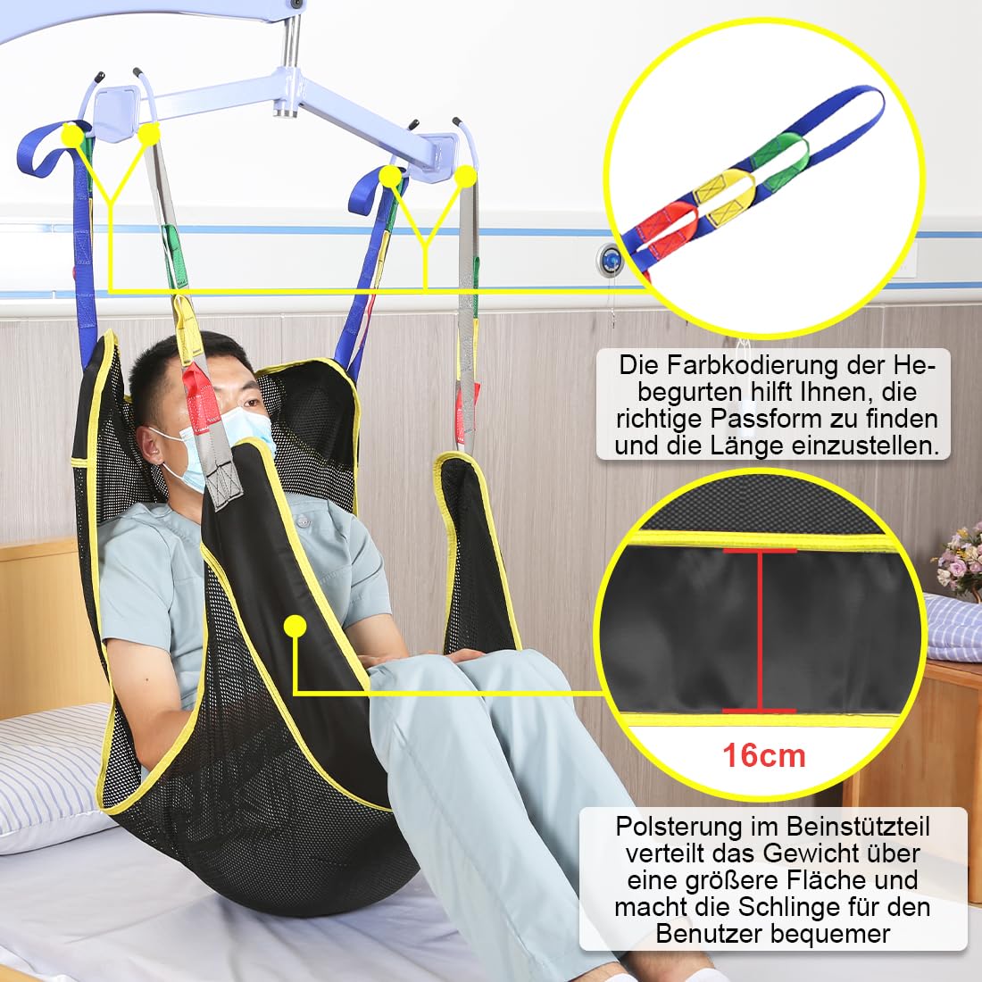 - 【Convenient Colored Hanging Loops and Handles】The design of the colored hanging loops helps nurses quickly identify and select the correct loops to hang on the hoist, improving safety and balance during operations. Furthermore, the back handle design allows nurses to more easily control the patient's positioning. A patient hoist can assist nurses in operations by stabilizing the patient's position.