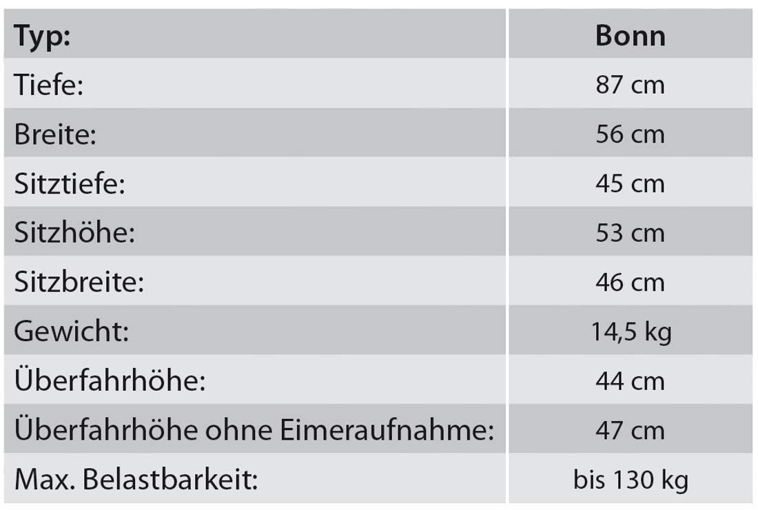 - With aid number for the health insurance company HMV No.: 18.46.02.0047 | Technical specifications: Height: Depth: 87 cm - Width: 56 cm - Seat depth: 45 cm - Seat height: 53 cm - Seat width: 46 cm - Weight: 14.5 kg - Drive-over height: 44 cm - Drive-over height without bucket holder: 47 cm - Max. load capacity: up to 130 kg