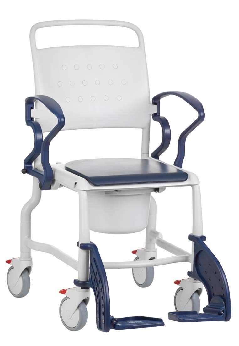 - The comfortable armrests of the toilet chair can be swiveled down, allowing for easy side entry. The footrests are height-adjustable, swivel down, and removable.