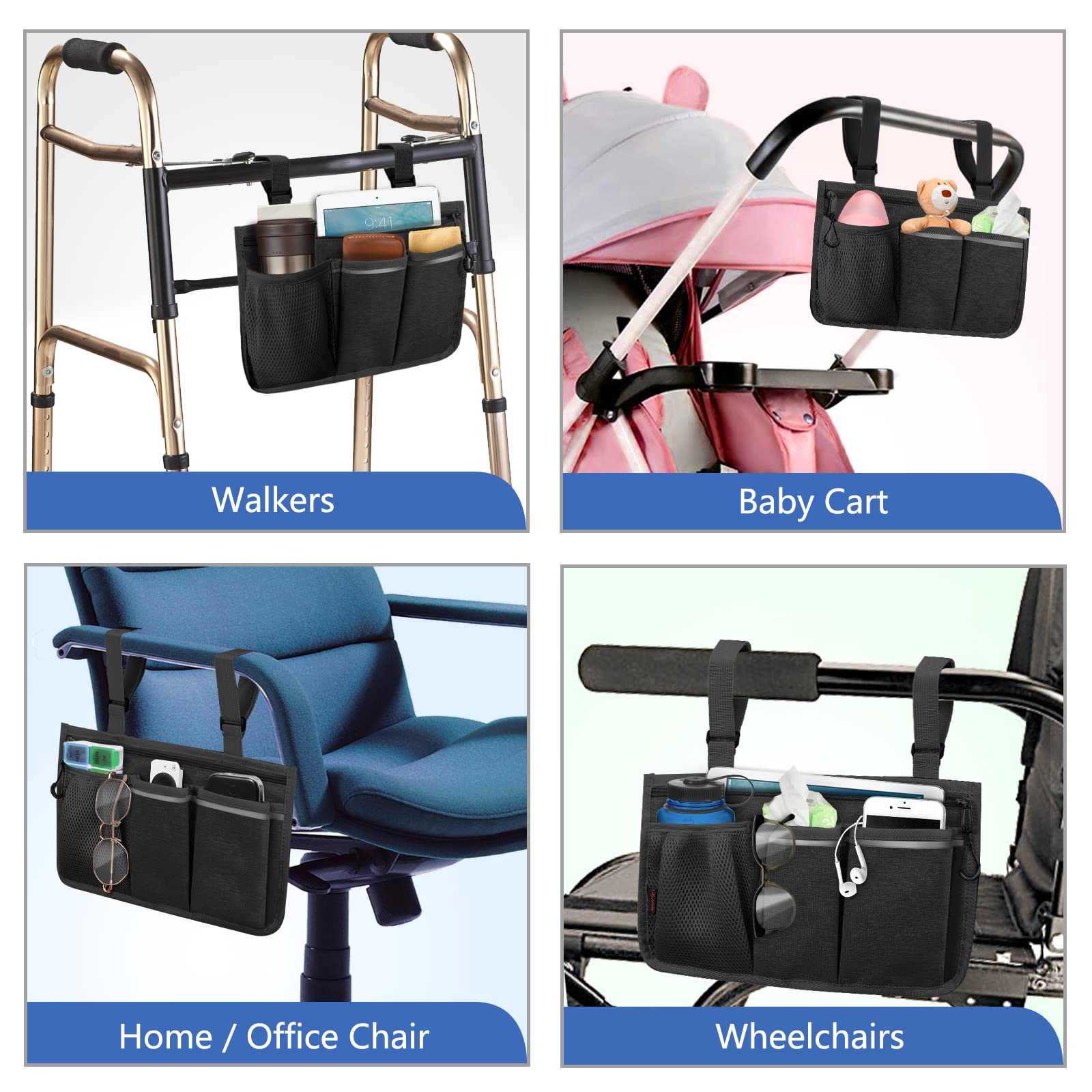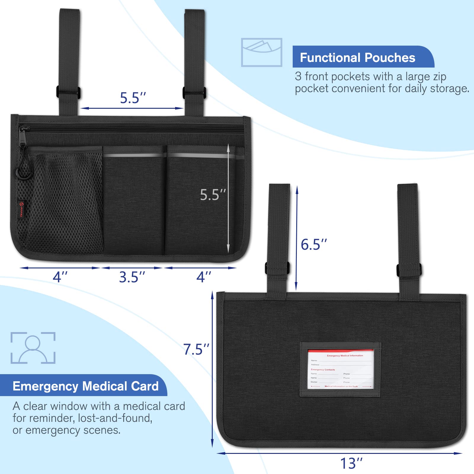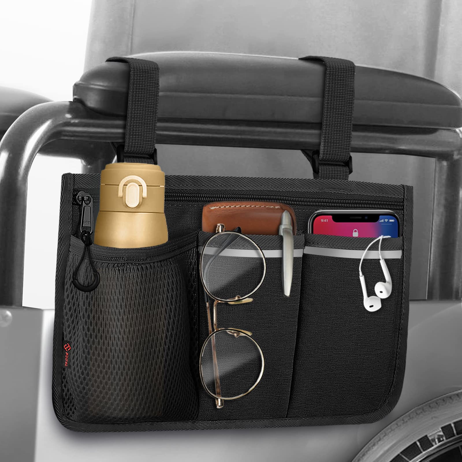 FINPAC Wheelchair Bag for Armrest - Wheelchair Bag with Reflective Stripes Wheelchair Bag with Name Card Pocket for Walkers, Mobility Scooters, Rollators, (Black)