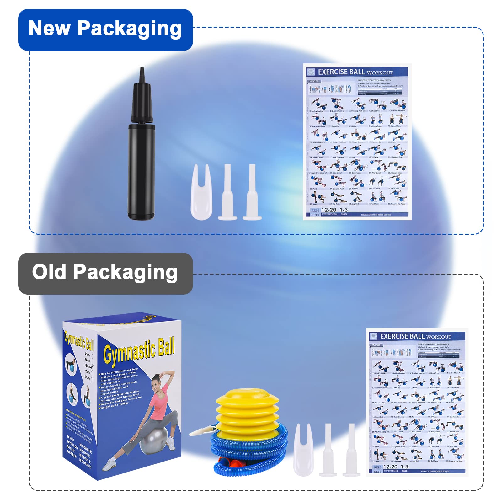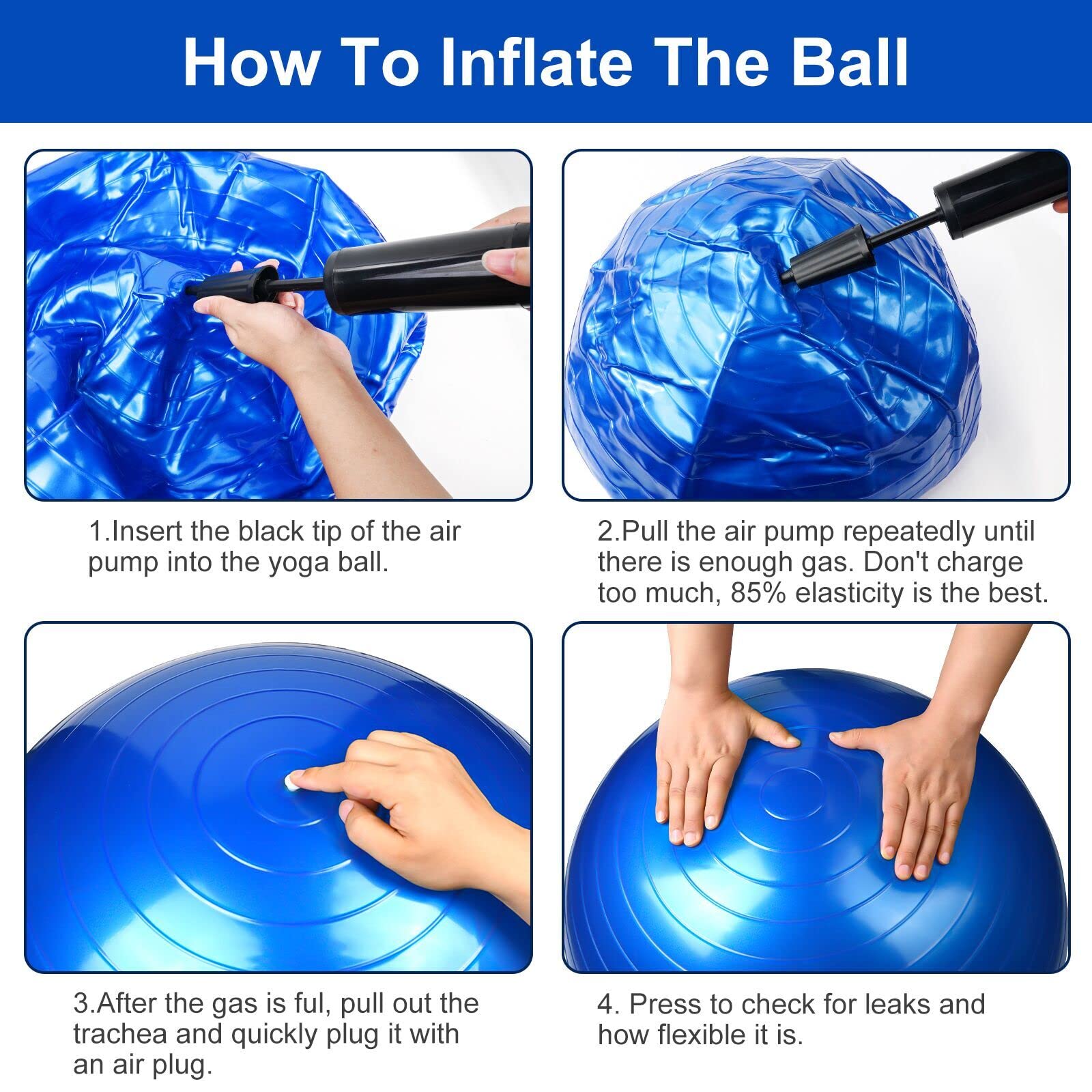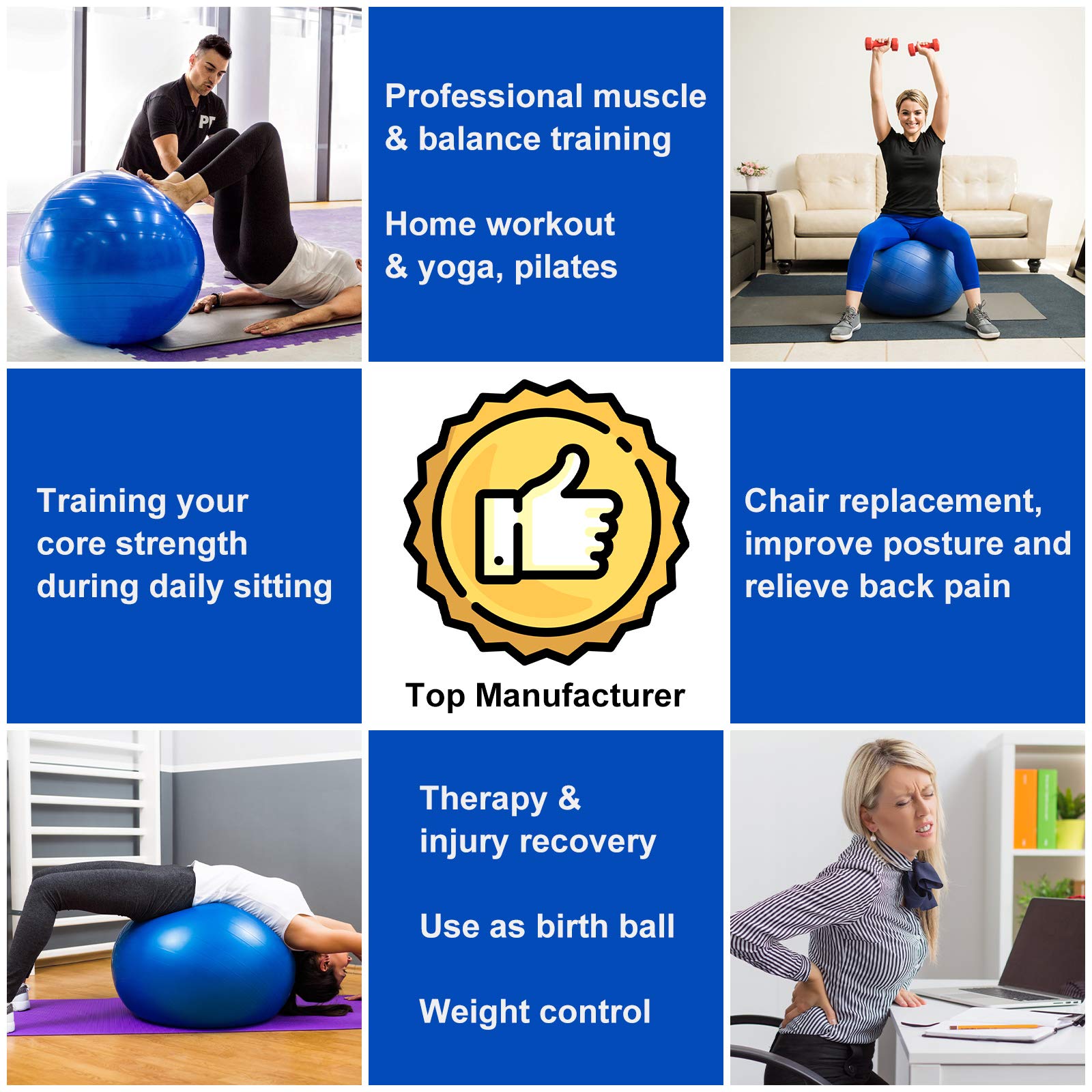 - 【DURABLE MATERIAL】: The fitness ball is made of high-quality thick PVC material. The explosion-proof and non-slip design ensures that the product remains soft and elastic when inflated, so you don't have to worry about accidental injury during fitness exercises like Pilates and yoga.