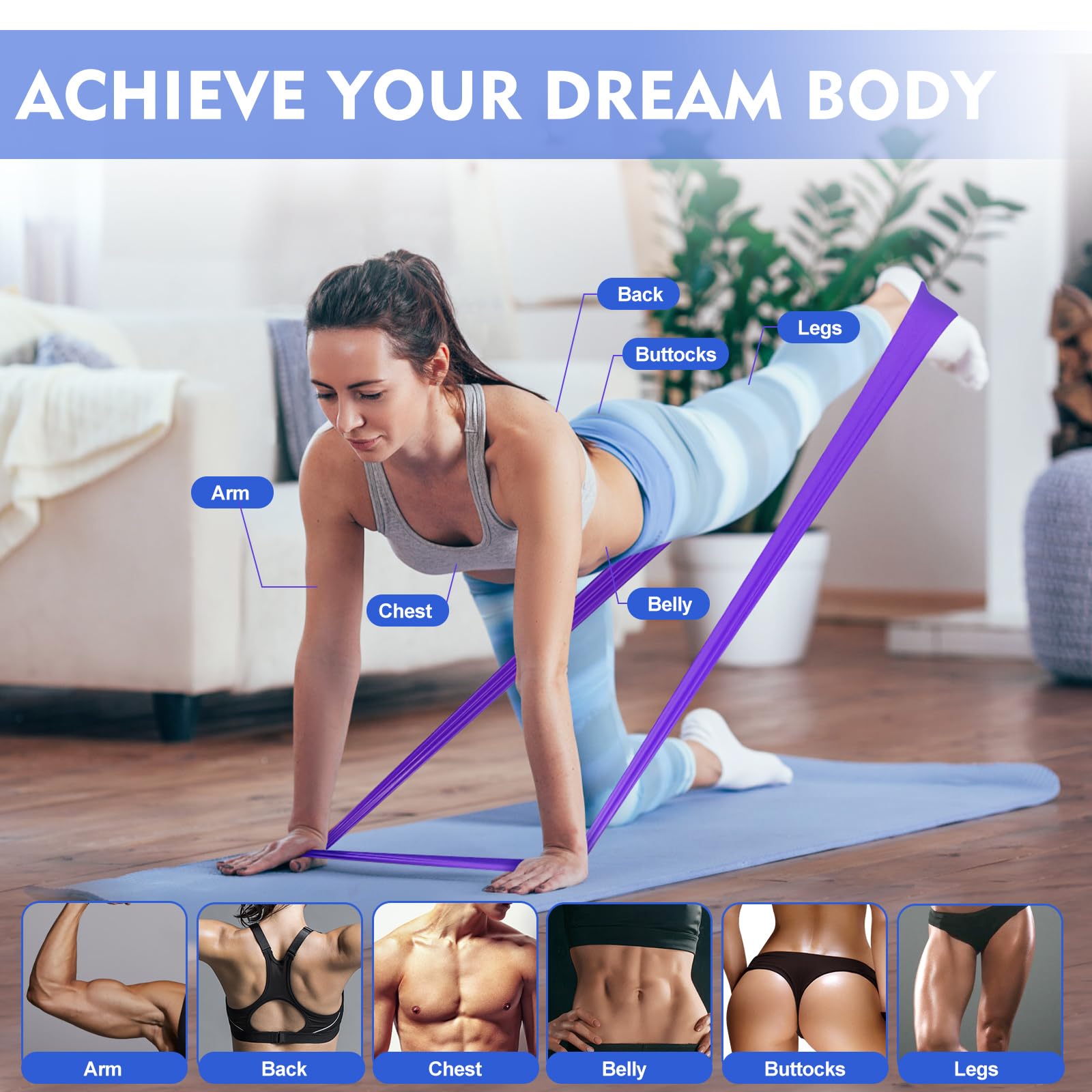- 【Fitness bands with 4 resistance levels】 The 1.8 m long resistance bands have 4 different resistance levels: Yellow (0.3 mm) 8-10 lbs/3.6-4.5 kg, Red (0.4 mm) 15-20 lbs/6.8-9 kg, Blue (0.5 mm) 25-30 lbs/11.3-13.6 kg, Purple (0.55 mm) 30-35 lbs/13.6-15.9 kg