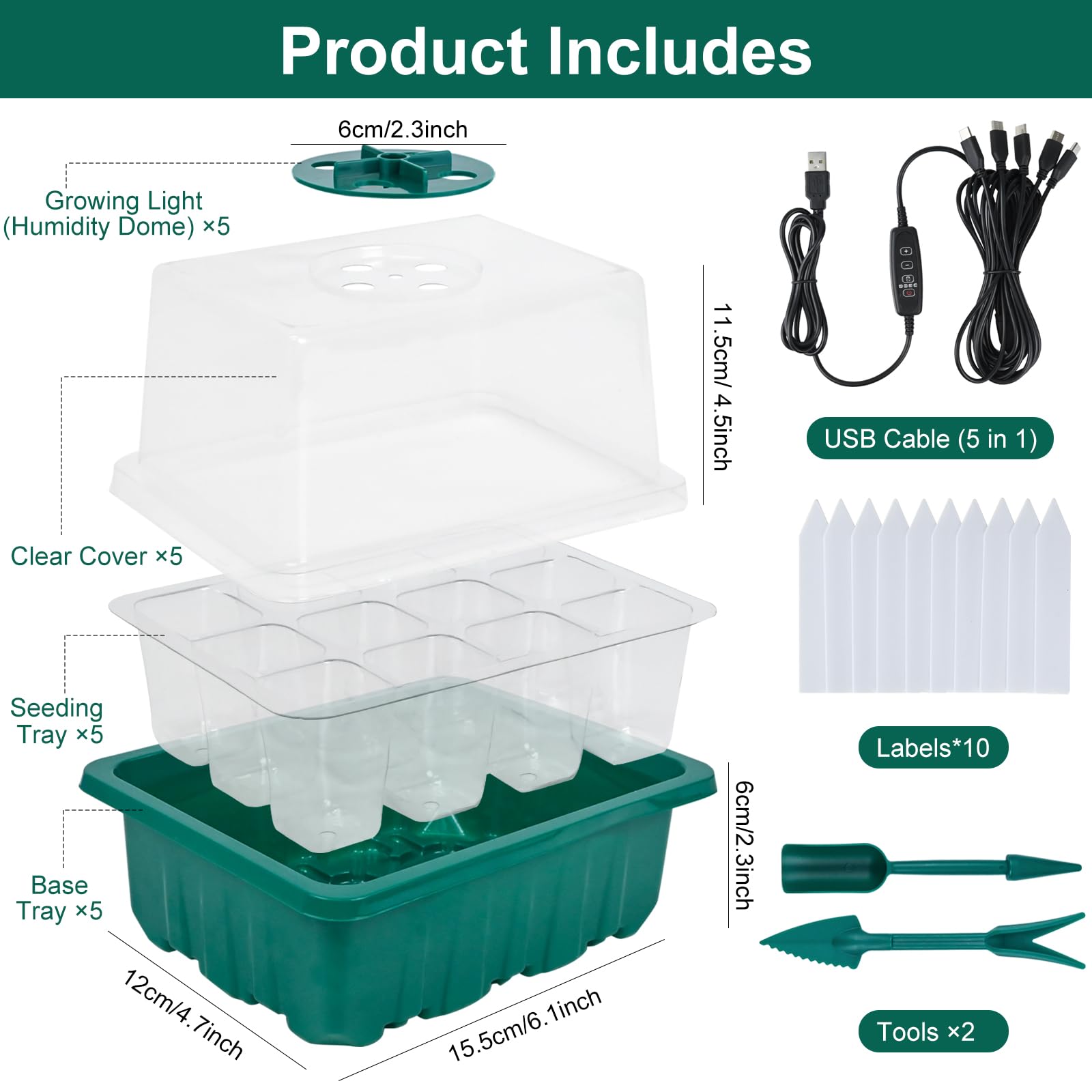 - đ±ăIndoor Greenhouse Seedling BoxăIncludes 5 green base trays, 5 clear base trays, 5 clear lids, 5 lighting bulbs, 2 tools, 10 white labels, 1 USB cable, and 1 instruction manual. The mini greenhouse is a convenient way to grow flowers, vegetables, and seedlings.