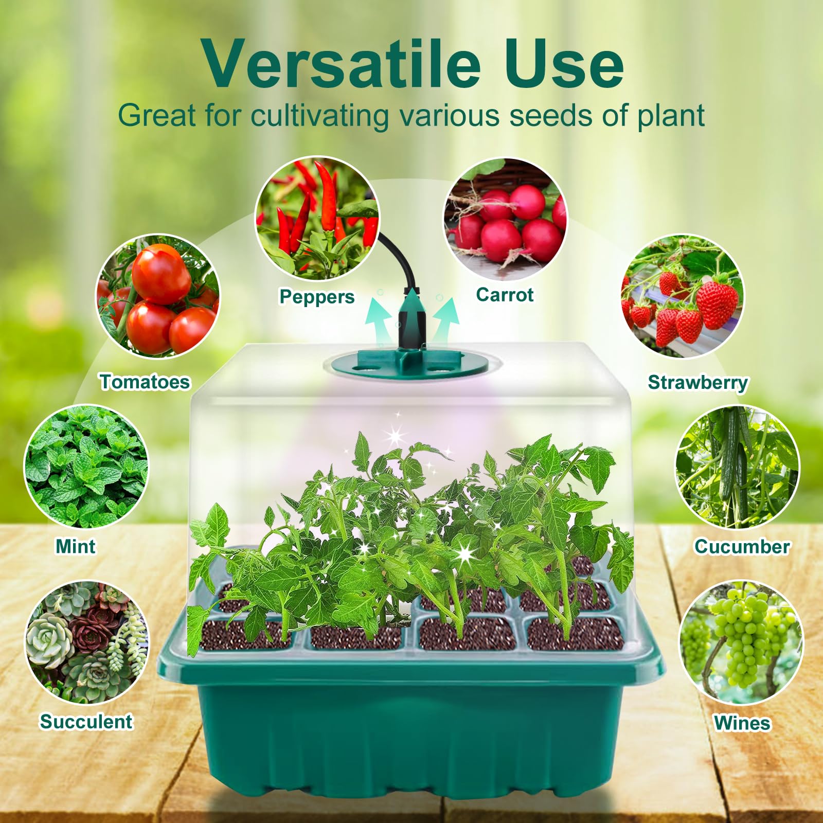- đ±ăEasy to UseăThe mini greenhouse is equipped with a USB cable, allowing up to 5 mini greenhouse seedling boxes to be connected simultaneously, making it very convenient. Each seedling box has 12 compartments, as well as tools and labels for easy sowing, loosening the soil, transplanting, and marking.