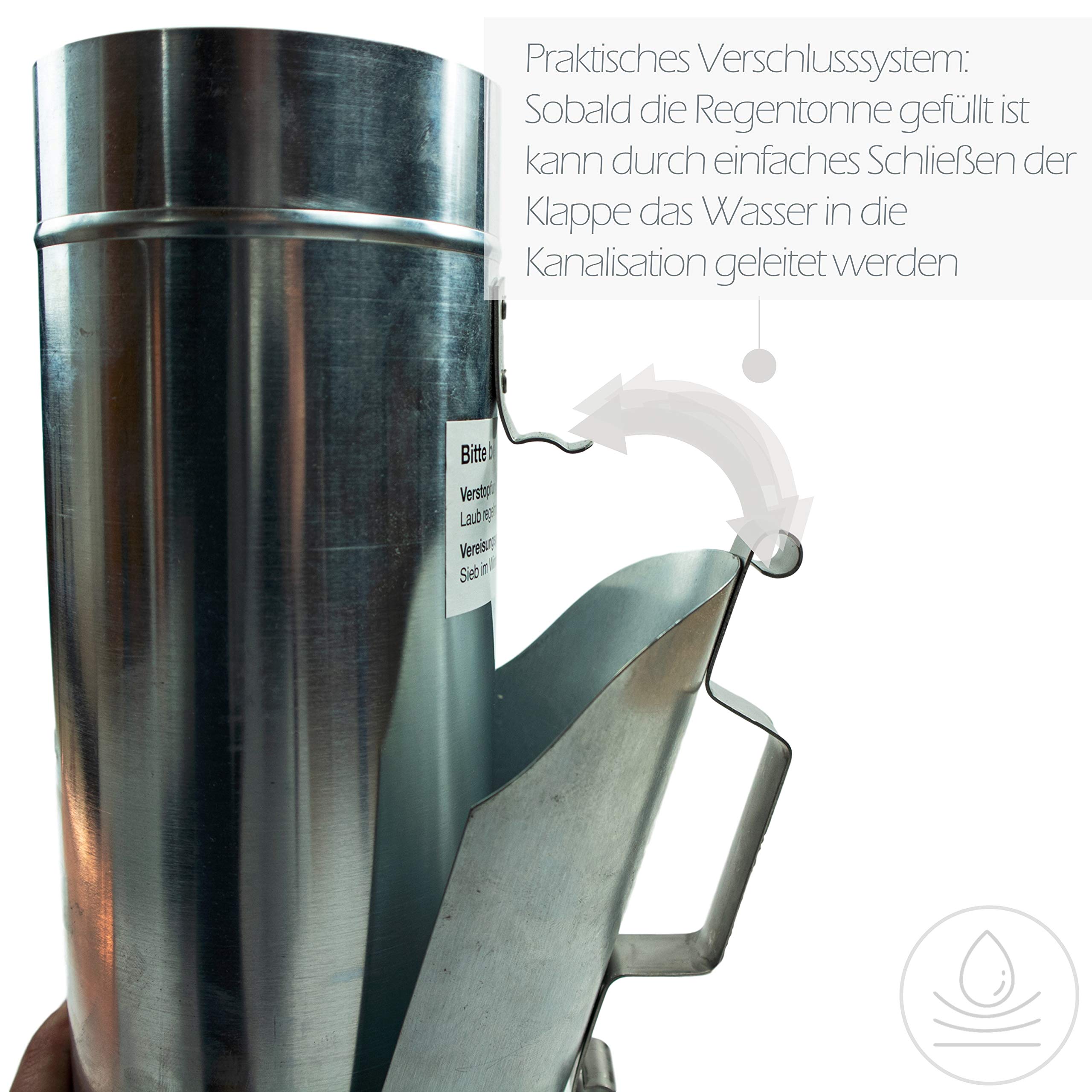 - The removable stainless steel sieve in the inspection flap prevents dirt from entering the rain barrel or downpipe