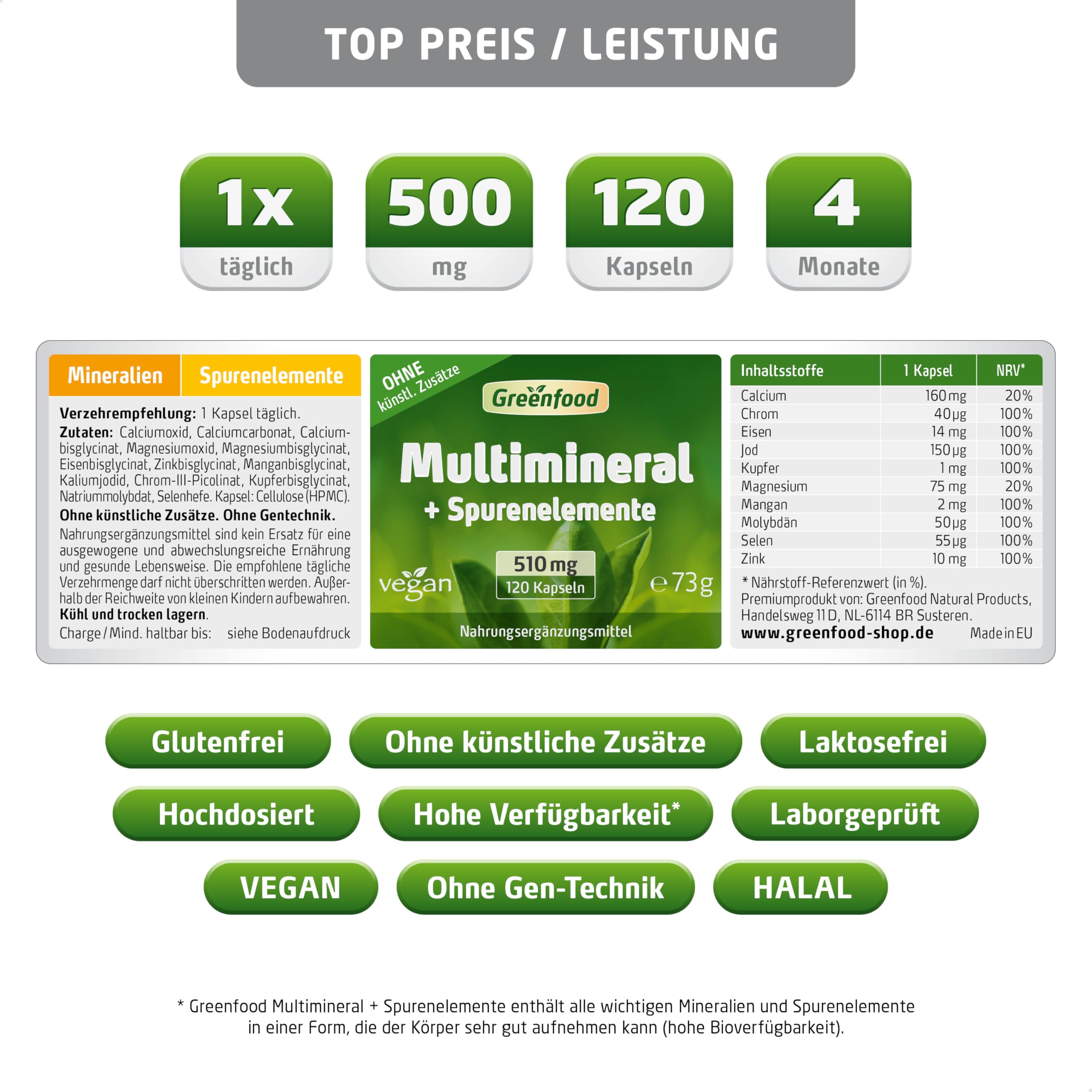 - HIGH-QUALITY RAW MATERIAL: Greenfood's Multimineral and Trace Element Complex contains a full range of minerals and trace elements, in high doses and with high bioavailability. A total of 120 vegan capsules with 510 mg of multiminerals and trace elements for optimal daily intake.
