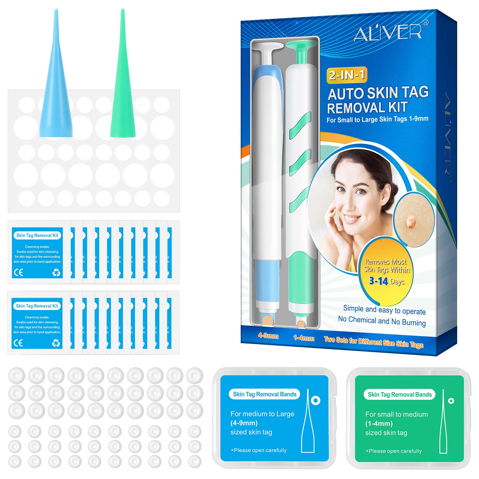 - 🆗【2 Sizes Skin Tag Remover Kit】The Uocasi tag removal kit includes regular and micro-sized devices for more precise tag removal. A 4-9 mm head is designed for larger skin tags and a 1-4 mm head is designed for smaller skin tags. It comes with 60 skin tag removal tapes, 36 skin repair patches, and 20 cleansing wipes.