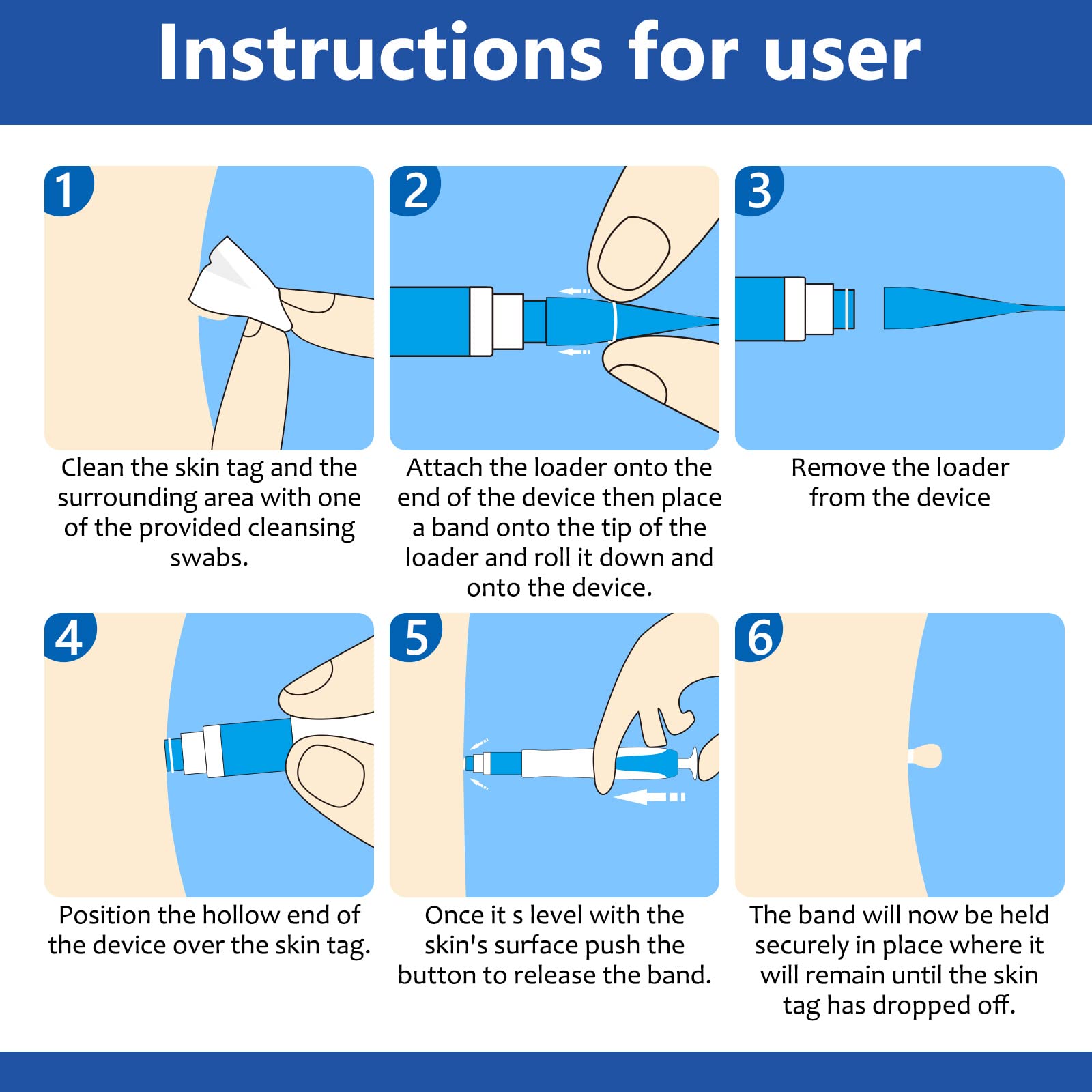 Product Description: AUTOMATIC SKIN TAG REMOVER KIT For small to large skin tags from 1-9mm Two sets for different sized skin tags No chemicals and no burning Simple and easy to use Includes 2 skin tag removal cones 30 bands for 1-4mm 30 bands for 4-9mm How does the skin tag removal device work? The skin tag removal kit simply stops the blood supply to the skin tags This causes the skin tag to shrink and fall off The color of the skin tag may change after the band is applied Most skin tags will come off within a week, some may take several days. Removes most skin tags within 3-14 days. Specification: Condition: 100% Brand New Color: As shown Package Size: 125 x 160 x 30mm Weight: 90g Package Includes: 2 x Skin Tag Remover Head 2 x Pen Band Remover 1 x User Manual 20 x Cleaning Wipes 30 x Small Rubber Bands 1-4mm 30 x Large Rubber Bands 4-9mm 36 x Skin Repair Patches