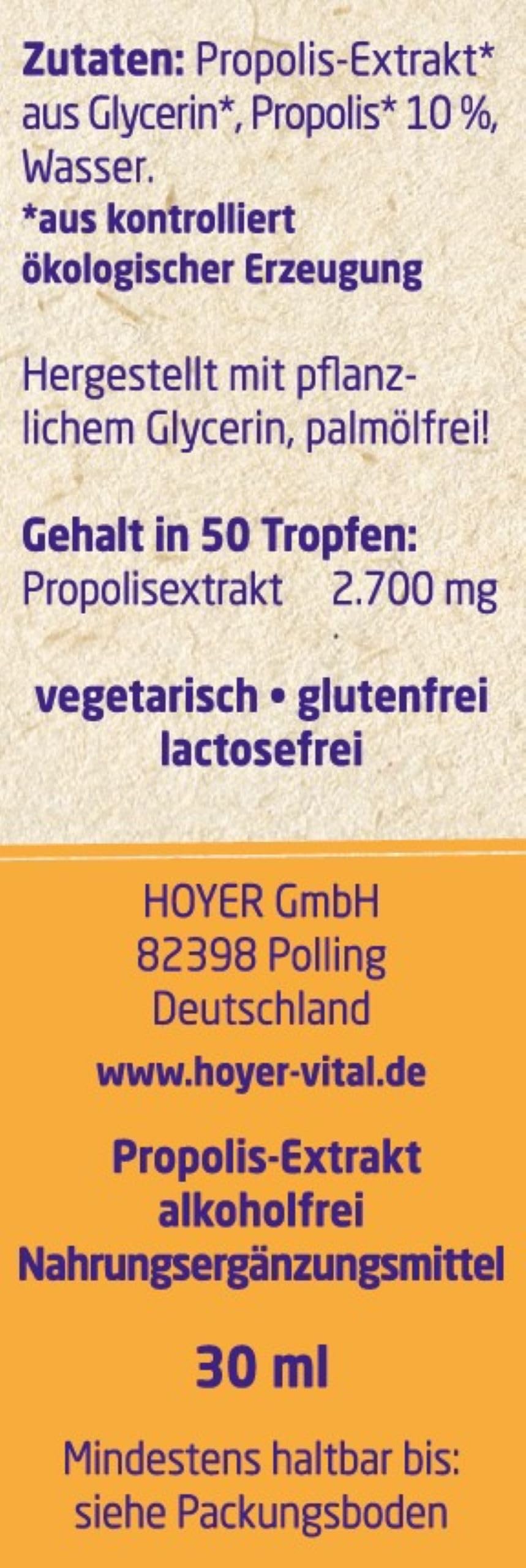 - Natural organic propolis: HOYER Propolis Extract is alcohol-free, water-soluble, and contains valuable organic propolis. The propolis extract comes from strictly controlled organic beekeepers.