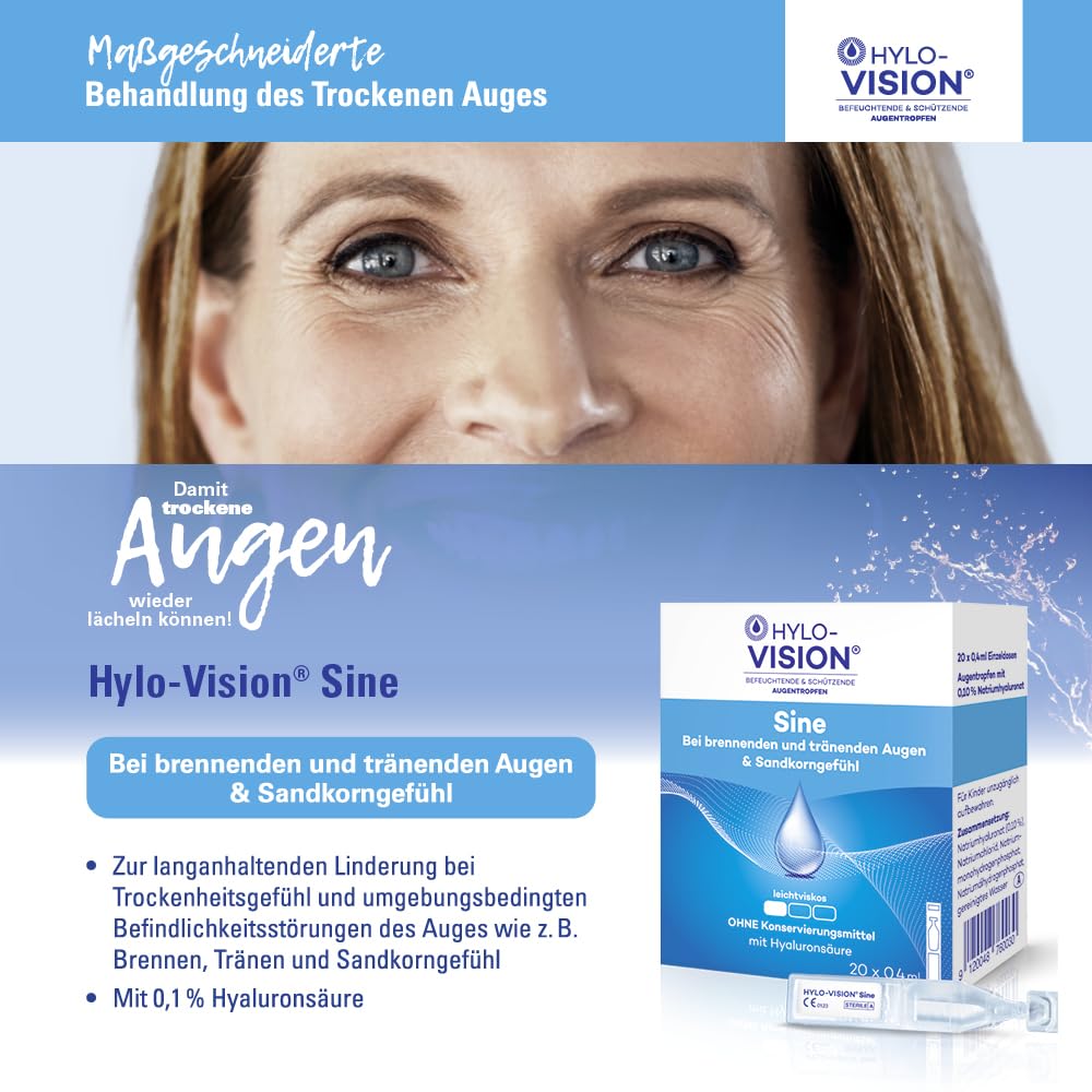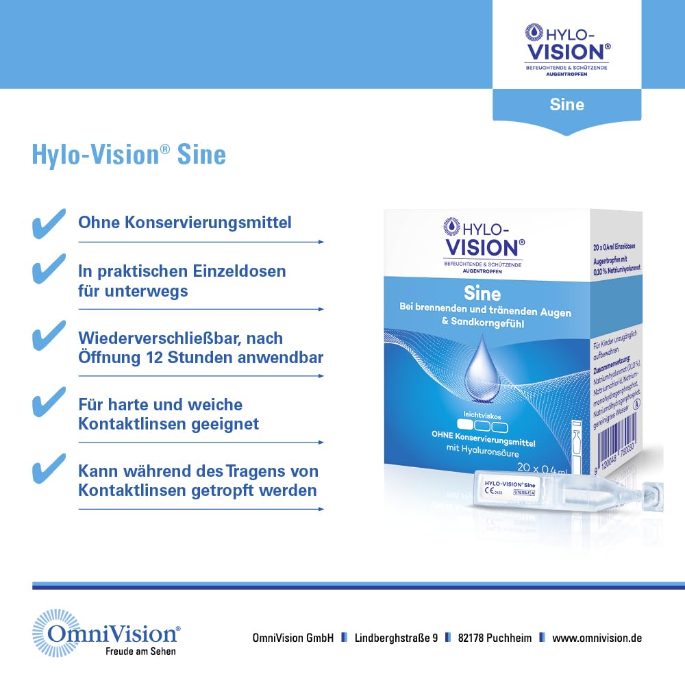 Hylo-Vision Sine eye drops – For dry, burning, watery eyes and a feeling of grittiness, ideal for on the go, slightly viscous, preservative-free, suitable for contact lenses, 20 x 0.4 ml