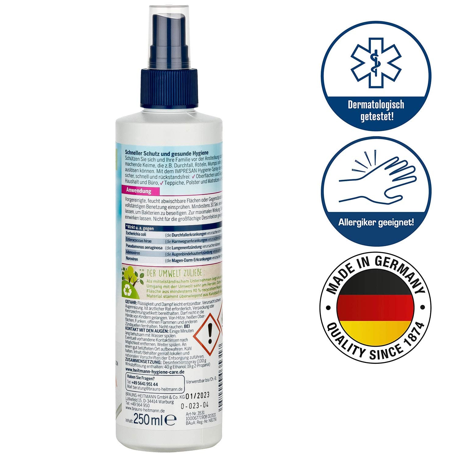 - DERMATOLOGICALLY TESTED: Impresan surface disinfectant spray is dermatologically tested and skin-friendly. However, it is not suitable for alcohol-sensitive surfaces (e.g., acrylic glass).