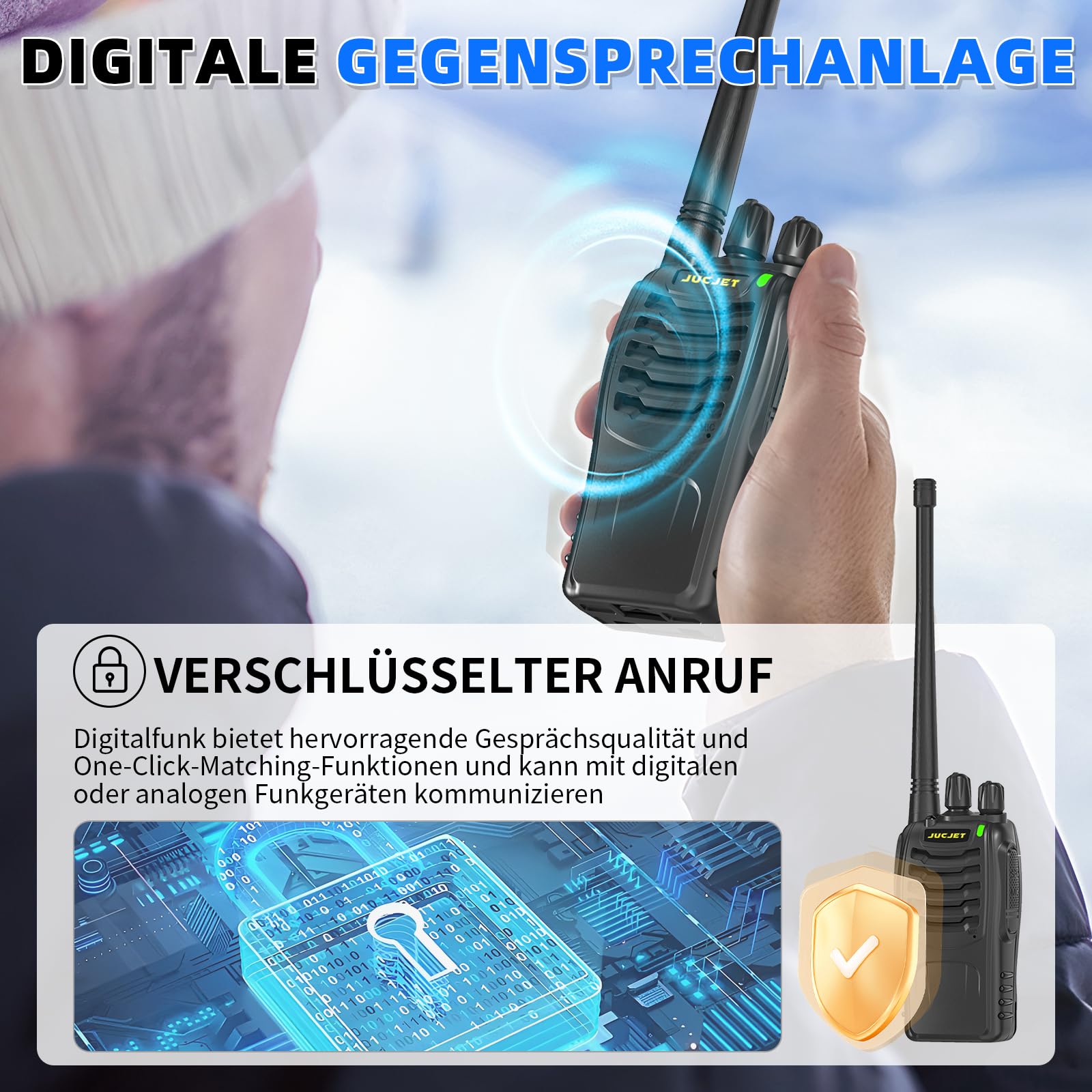 JUCJET (2-pack) 888HD Walkie Talkies, including original earpieces, Type-C data cable, USB charging station, with one-click pairing, speech noise reduction, and digital encryption