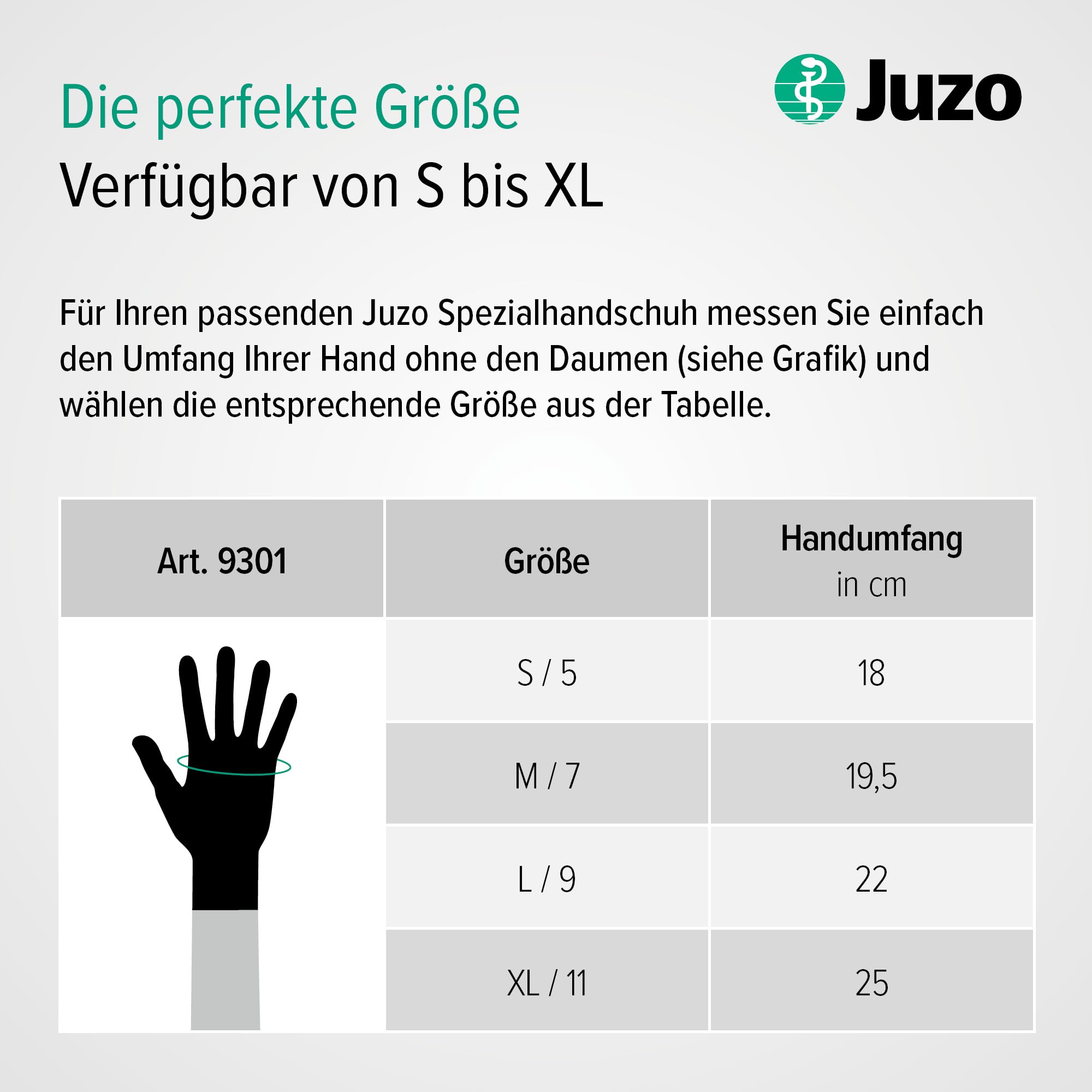 To find the right Juzo special glove for you, simply measure the circumference of your hand without the thumb and select the appropriate size: