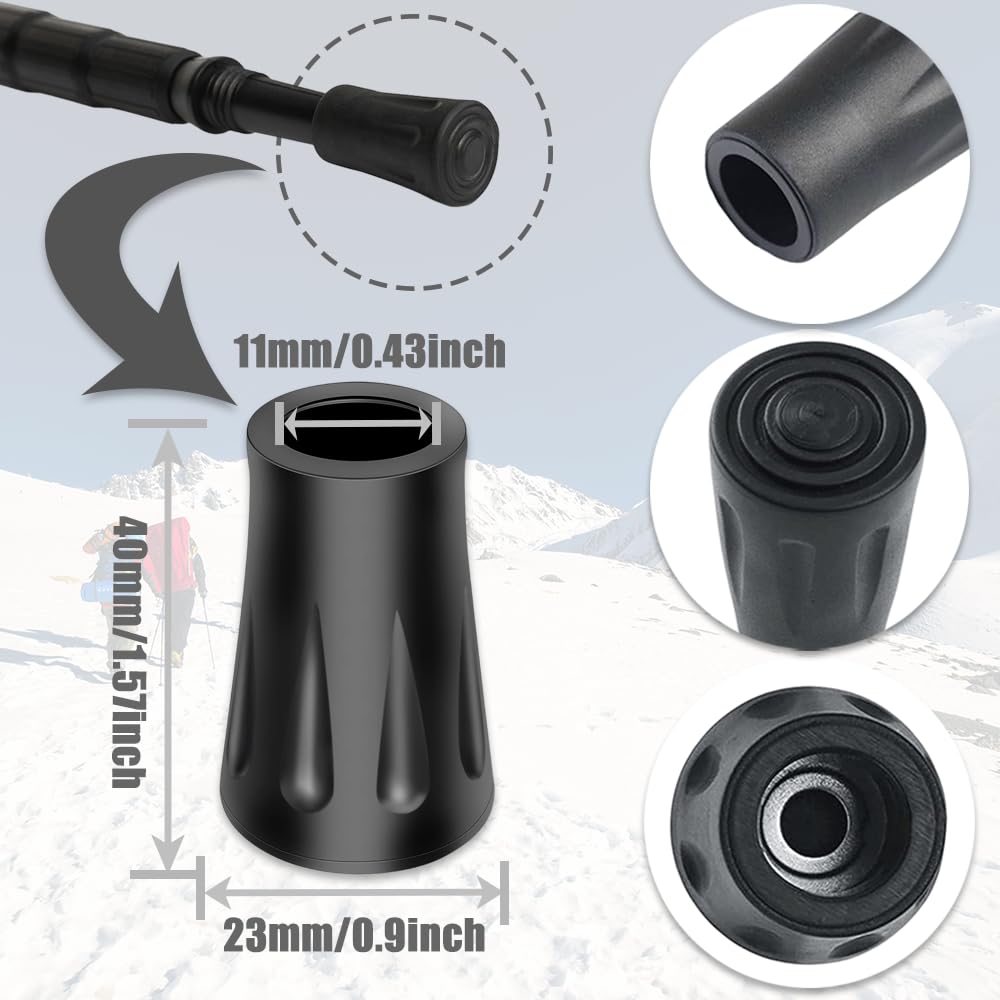 - 【Standard Size】These trekking pole tips have a hole with a diameter of 11 mm/0.43 inches. The height is 40 mm/1.57 inches. The rubber tips of the trekking poles are designed to fit most standard trekking poles.