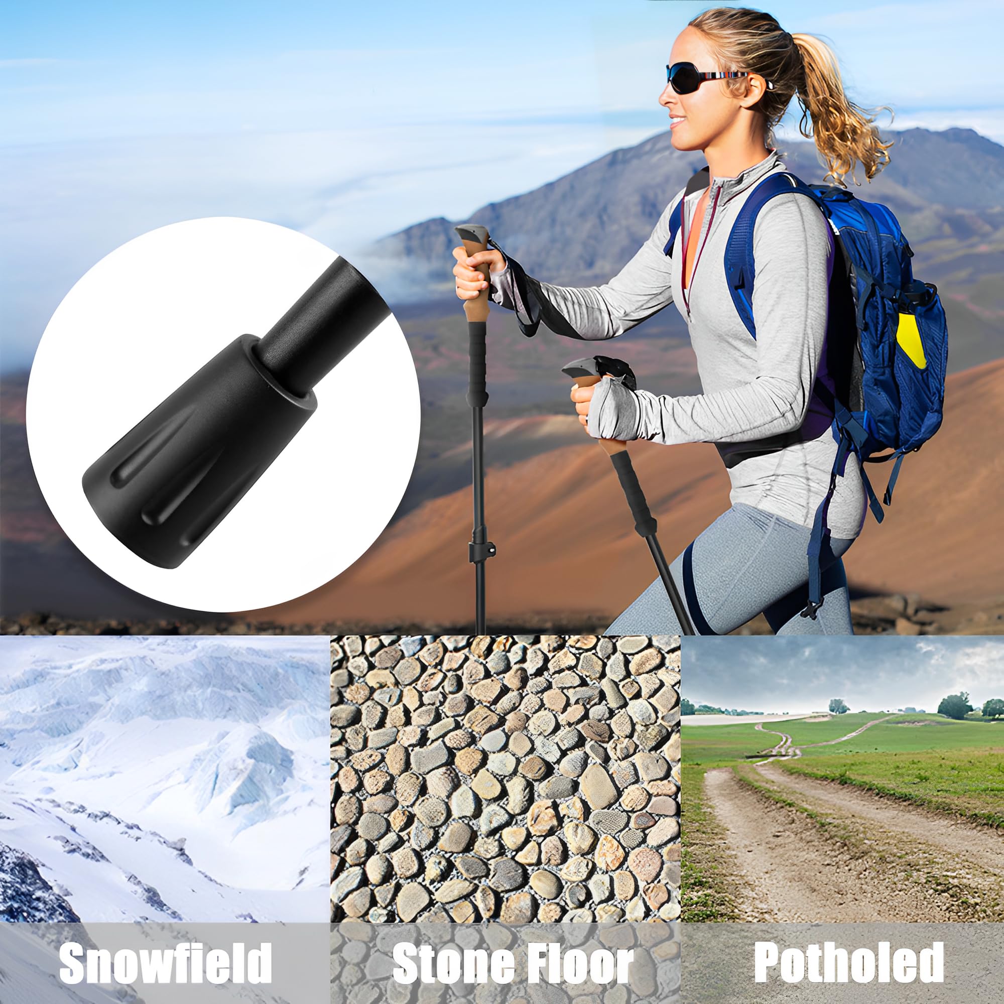 - 【Trekking Pole Tips Protectors】 These rubber hiking pole tips can prevent premature wear of the trekking pole tips, ensure a long service life of the trekking poles, effectively reduce the friction between the pole and the road, and provide a comfortable walking experience.