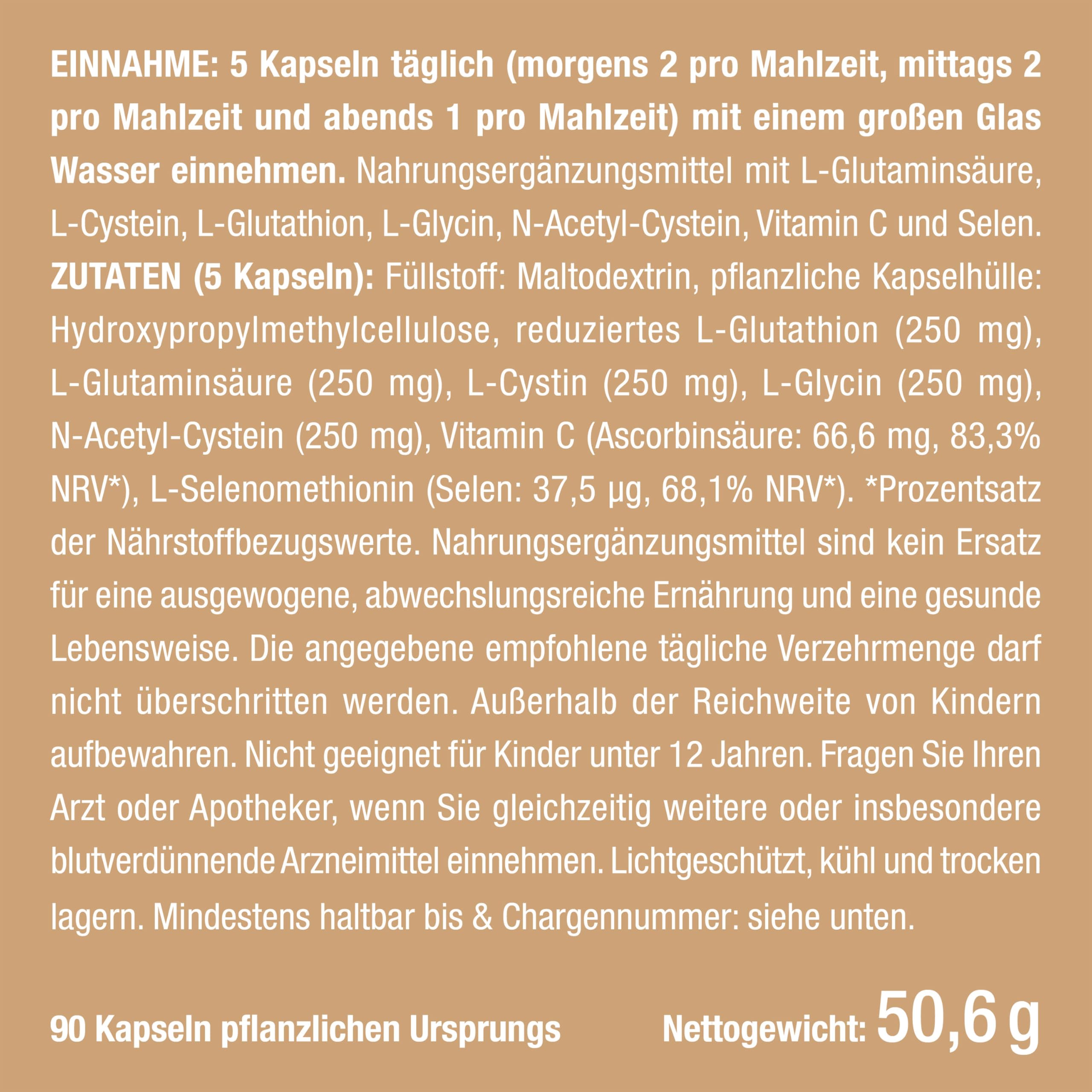 INGREDIENTS (5 capsules): Bulking agent: maltodextrin, vegetable capsule shell: hydroxypropylmethylcellulose, reduced L-glutathione (250 mg), L-glutamic acid (250 mg), L-cystine (250 mg), L-glycine (250 mg), N-acetylcysteine (250 mg), vitamin C (ascorbic acid: 66.6 mg, 83.3% NRV*), L-selenomethionine (selenium: 37.5 μg, 68.1% NRV*). *Percent of nutrient reference values.