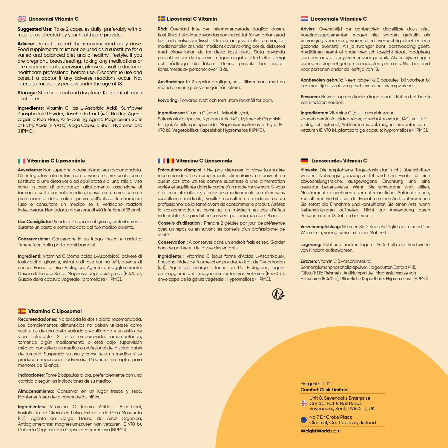 - Ingredients & Dosage Per Serving - WeightWorld Liposomal Vitamin C Capsules contain 1000mg ascorbic acid and an additional 30mg rosehip powder and 100mg sunflower phospholipids. One pack contains 180 vegan capsules, sufficient for a 3-month supply.