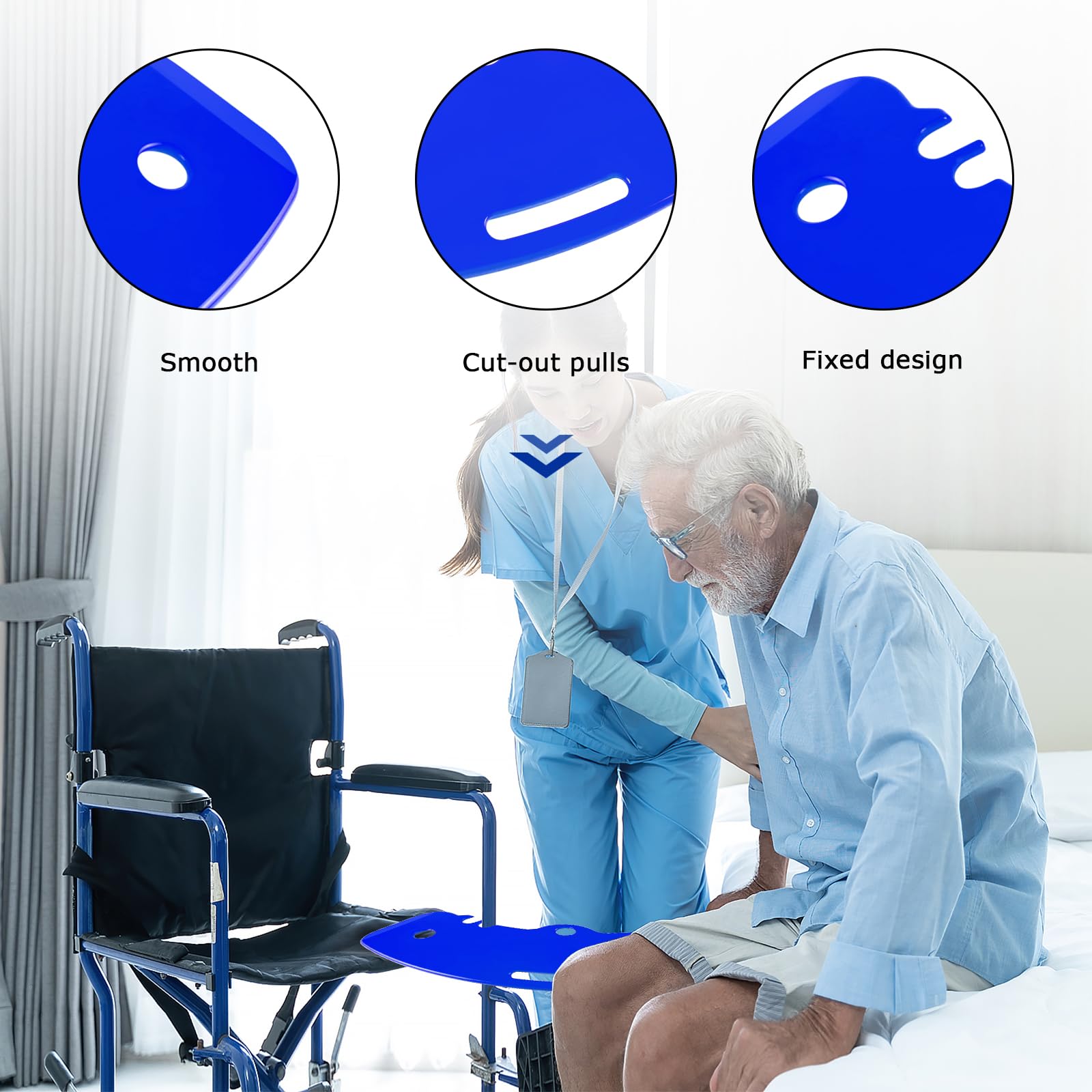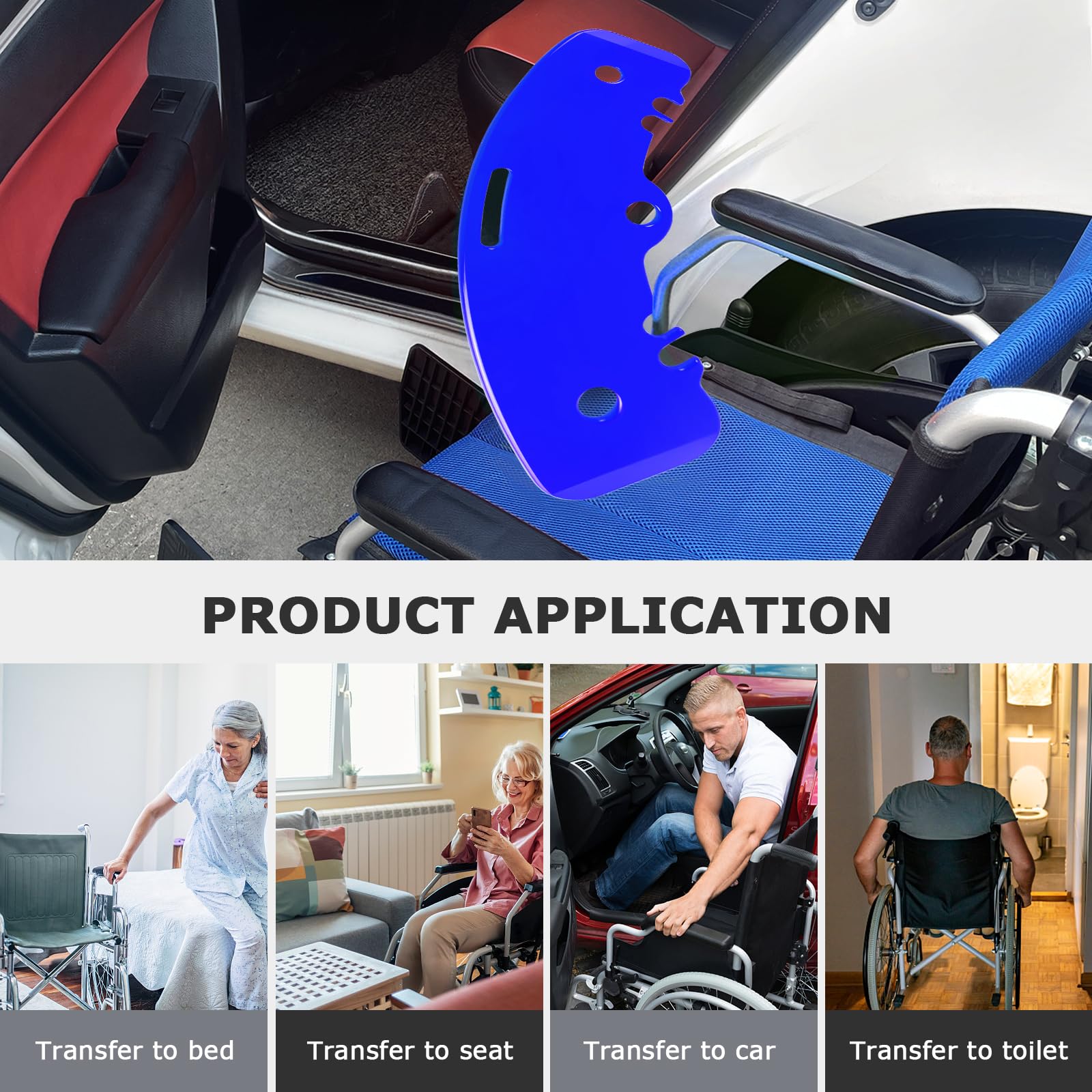 - Cutout design: The transfer board has cutouts so it easily fits around wheelchair tires or chair legs. The grab handles also provide additional stability and comfort. And the round hole for hanging the transfer board