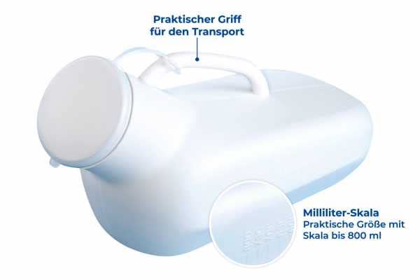 Details: With a tight seal and a scale up to 800 ml: If you can't reach the next toilet in time, the urine bottle is a discreet savior.