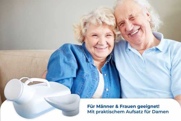 Whether in bed or in the car, this urine bottle can be used anywhere and is ideal not only for men. Thanks to the included attachment, the unisex urine bottle is also suitable for women.