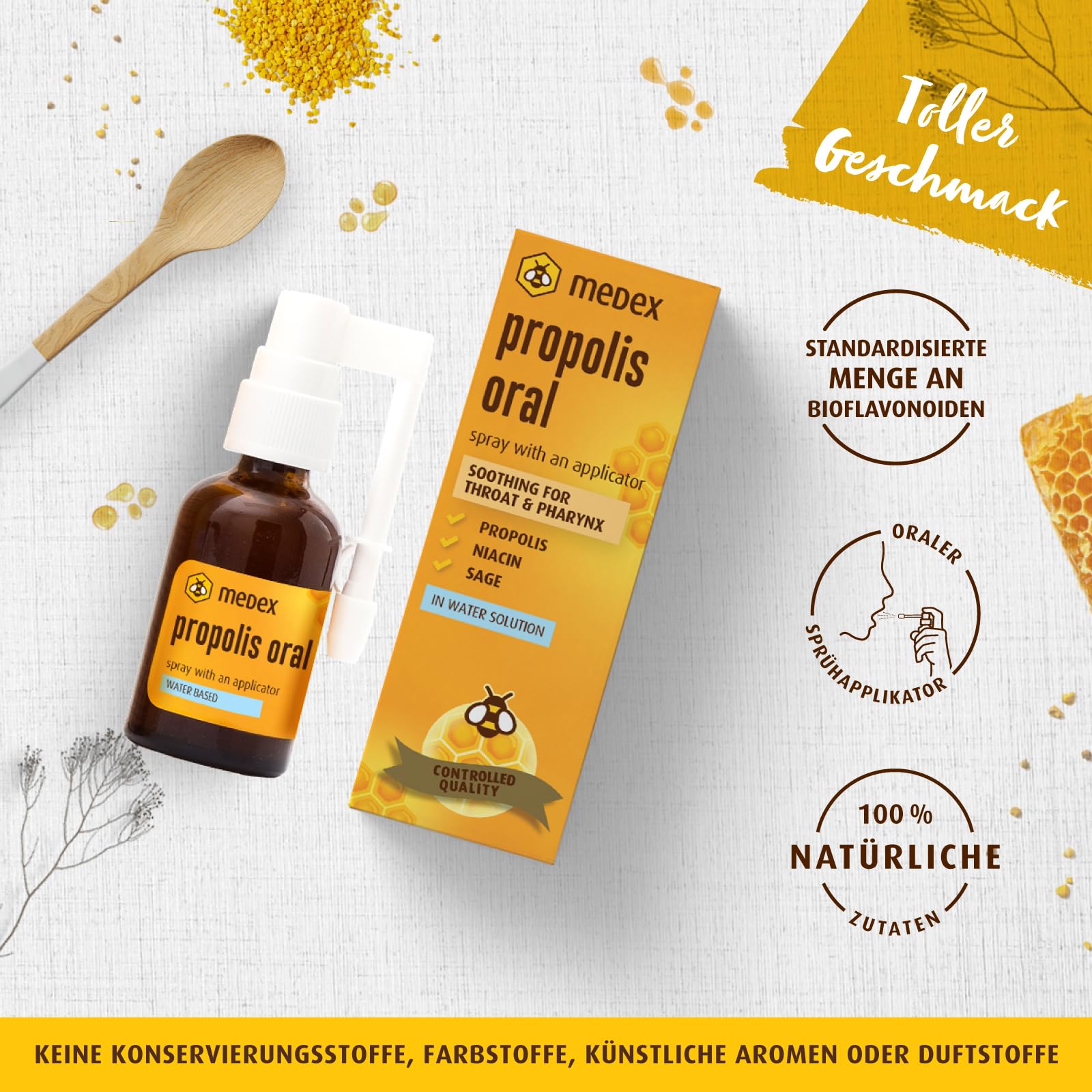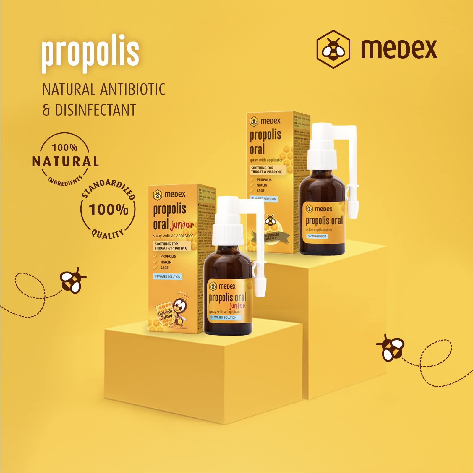 - 🐝 PROPOLIS SPRAY WITH STANDARDIZED AMOUNT OF BIOFLAVONOIDS - The most important substance in propolis is bioflavonoids – substances that protect plants from microorganisms. Their content determines the quality of the propolis. At Medex, we have standardized their content and can thus guarantee consistent quality throughout the product's lifespan.